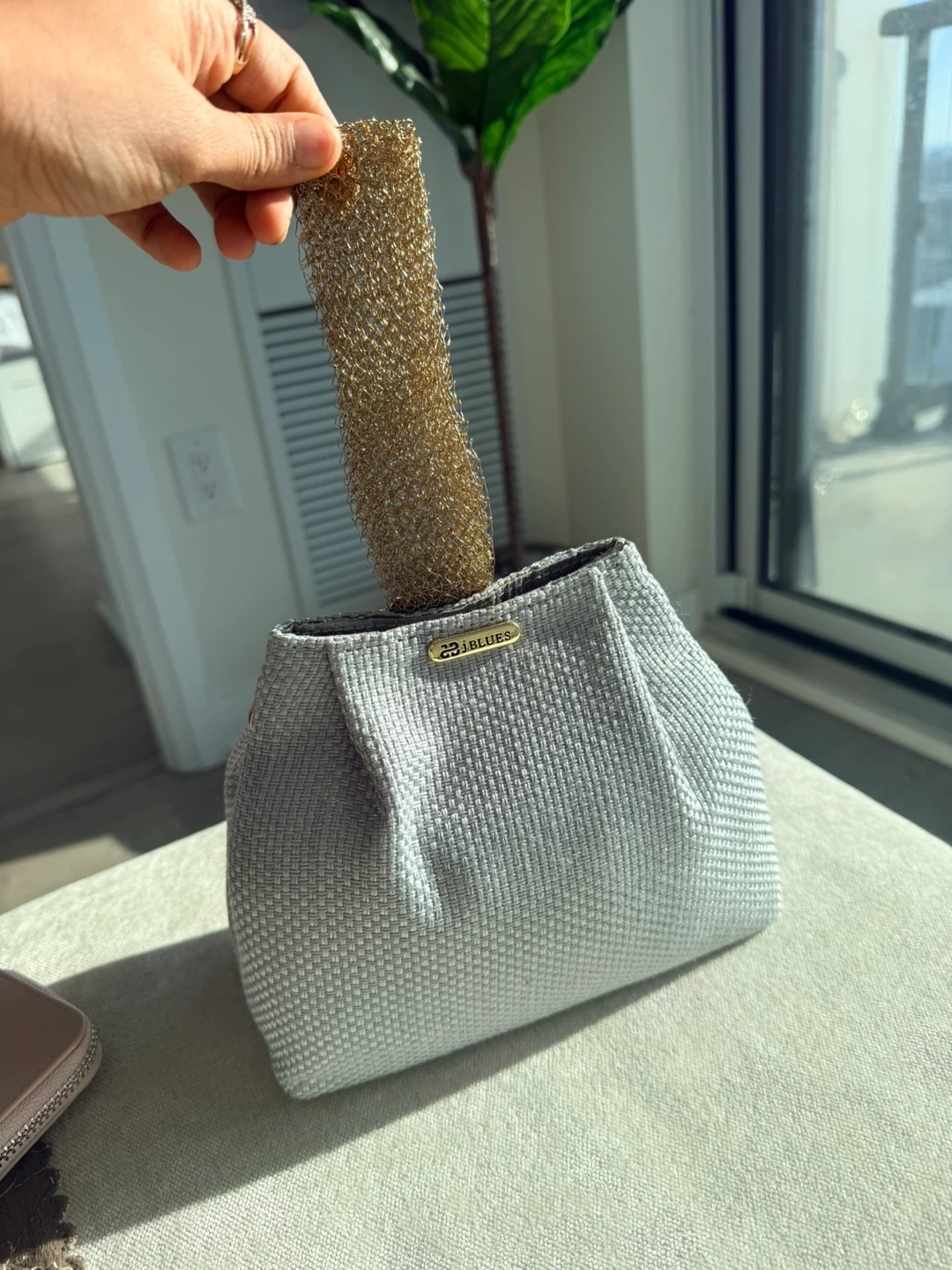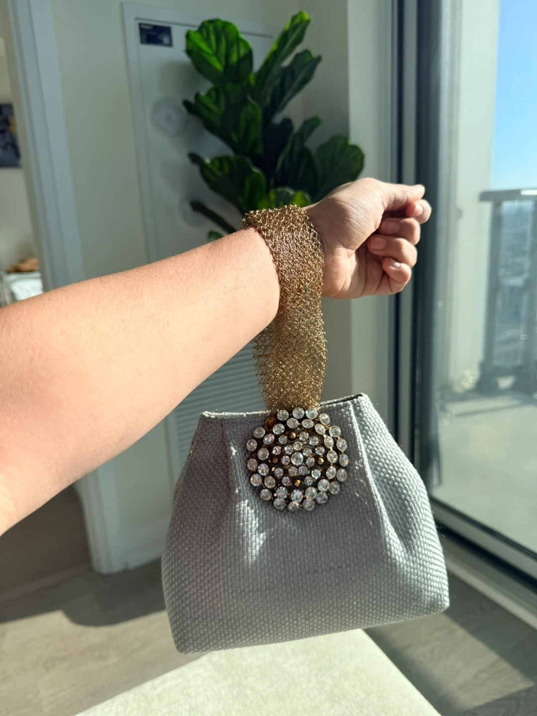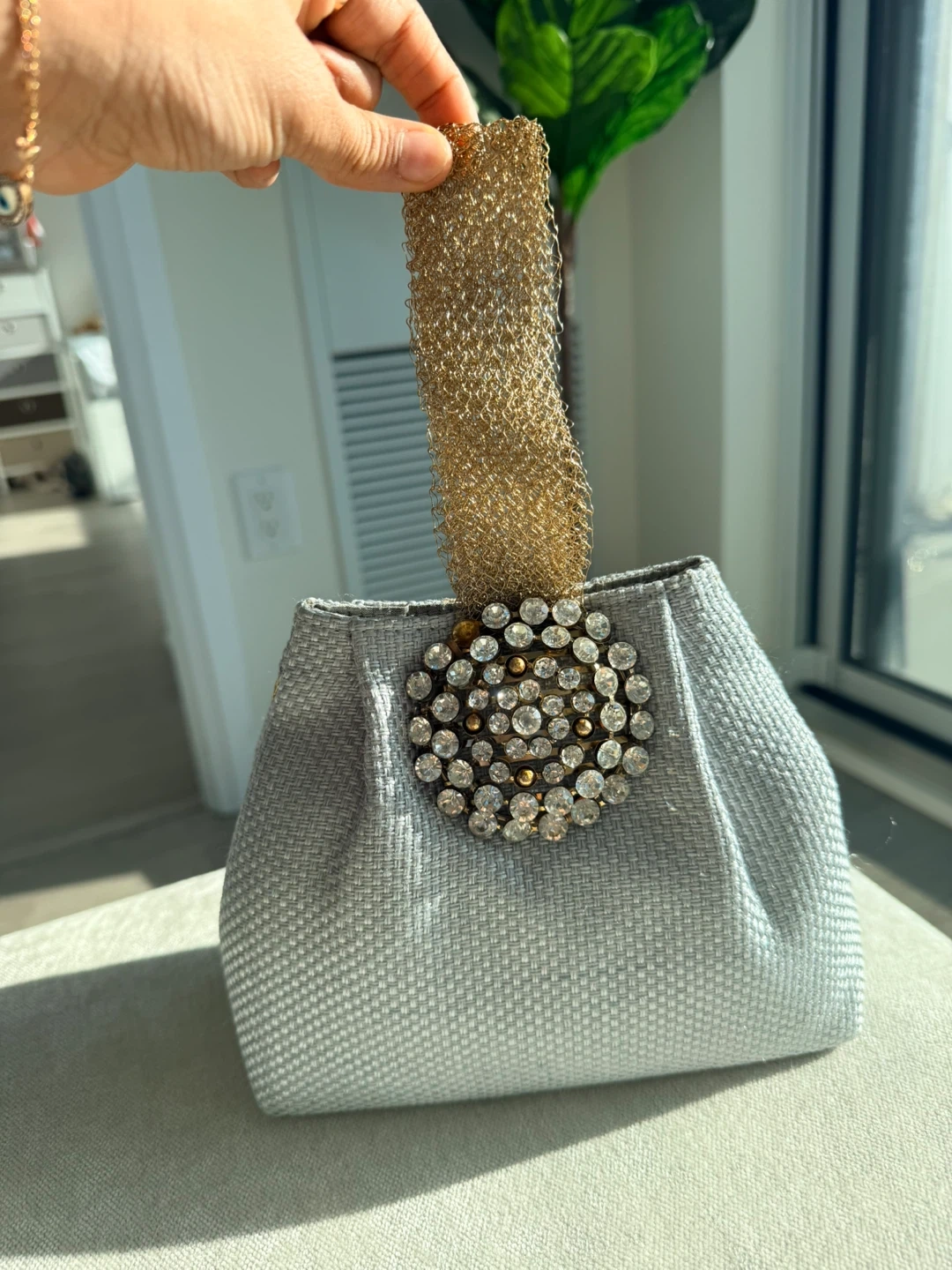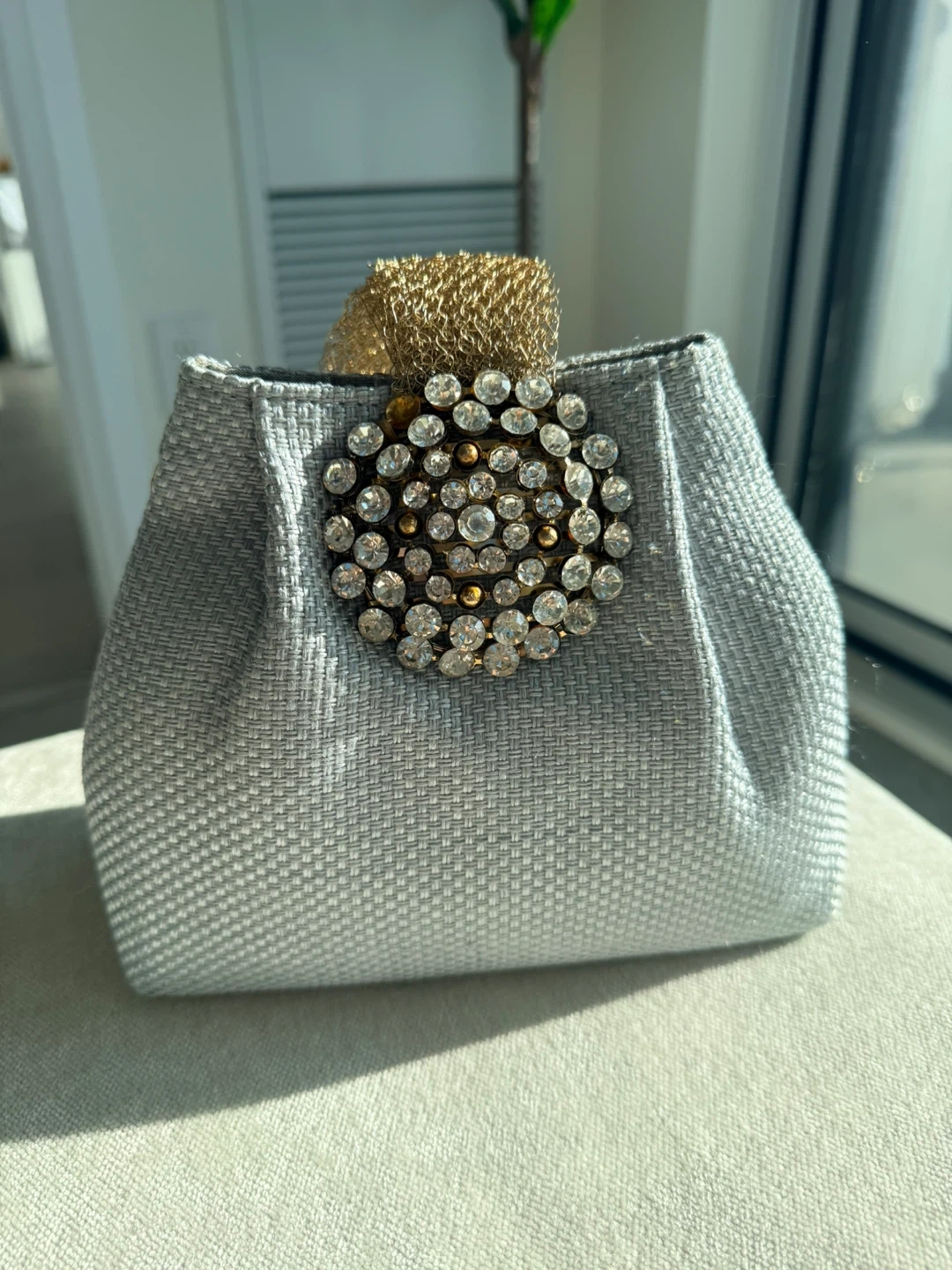 Stylist clucth for any occasion. It features a shimmering gold chain handle and is adorned with a sparkling crystal embellishment. The bag has a textured grey fabric exterior.