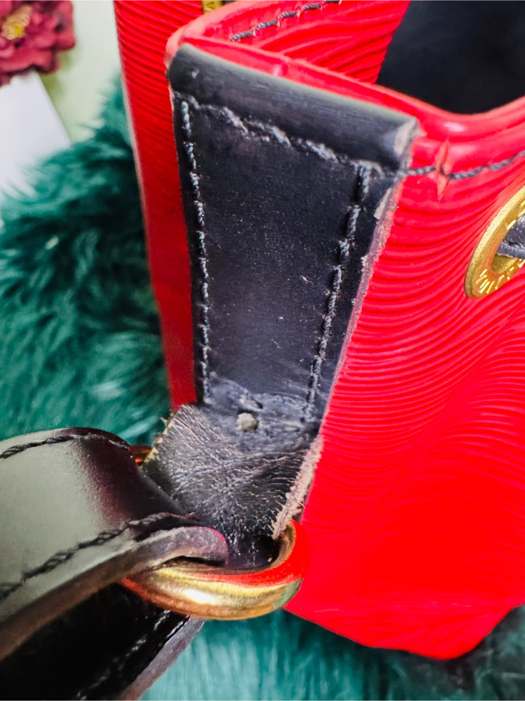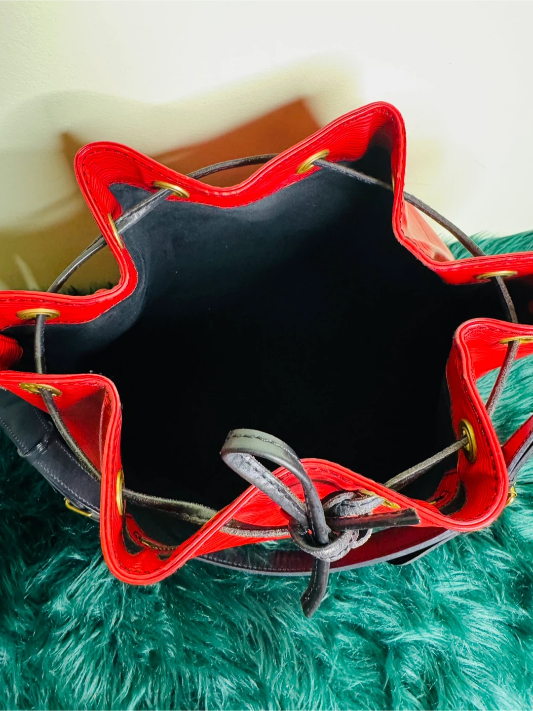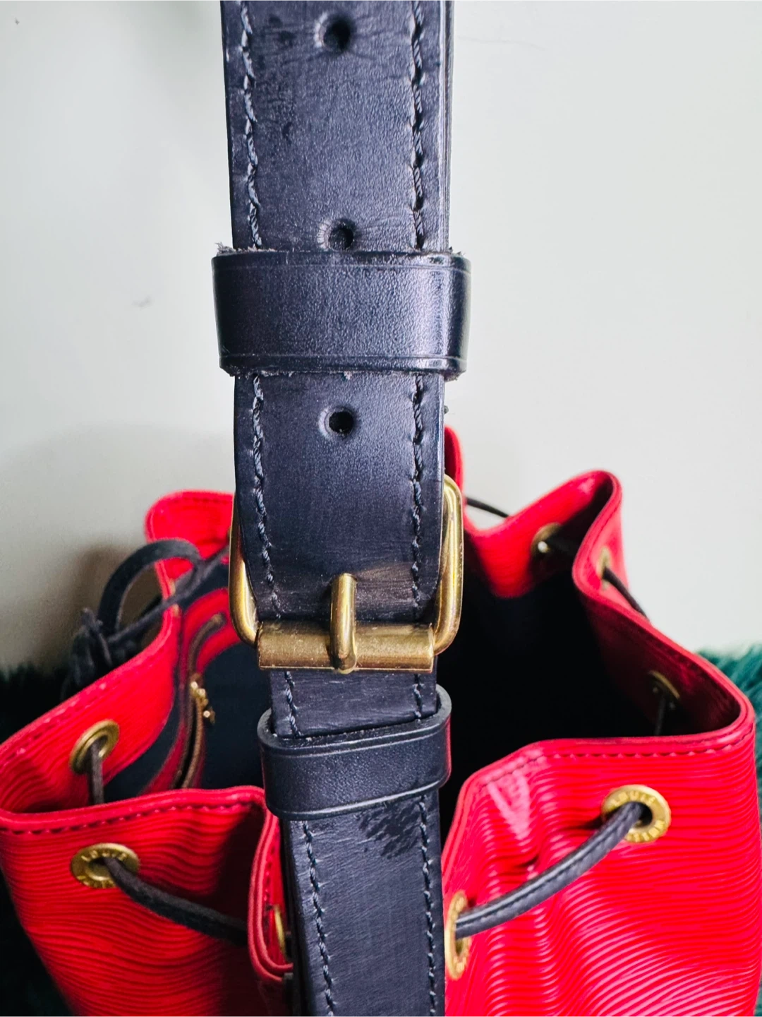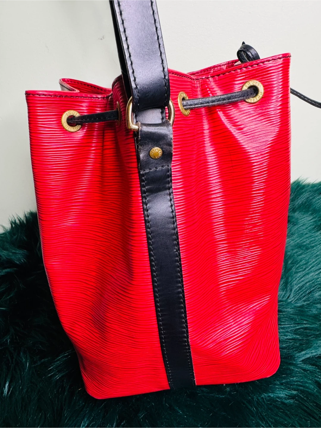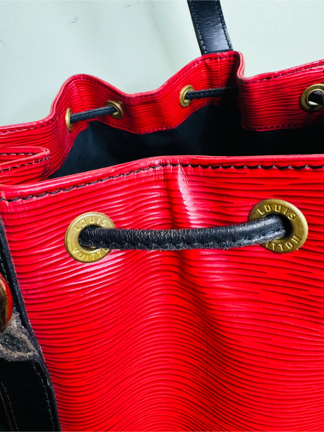 This is a Louis Vuitton Noé bucket bag in red Epi leather. It features a black leather drawstring closure and adjustable shoulder strap. This bag's classic design makes it a stylish accessory for everyday use.
