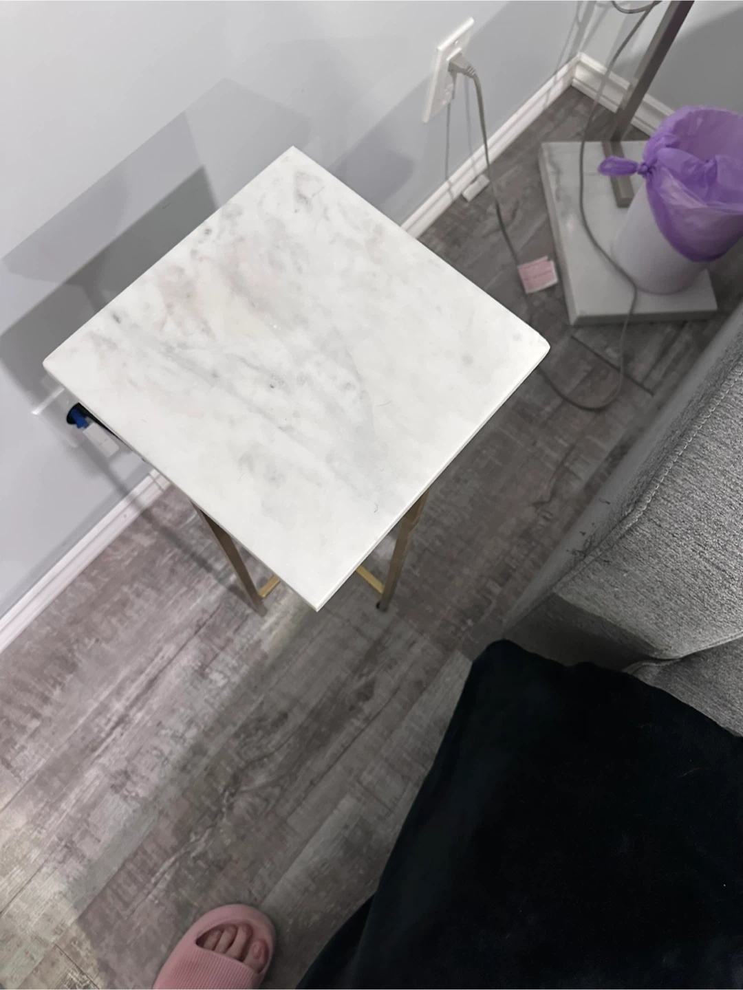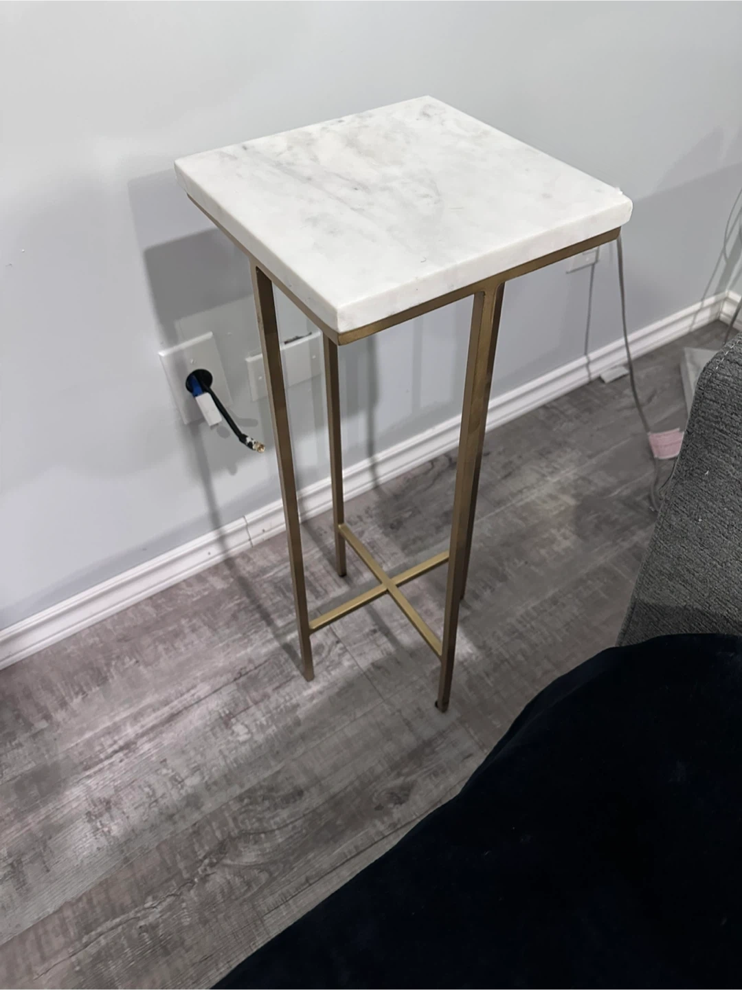 A stylish side table with a faux marble top and gold metal legs. It's compact and perfect for placing next to a sofa or chair. Its slim design makes it easy to fit into smaller spaces.