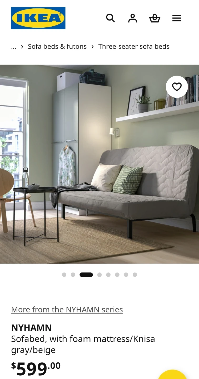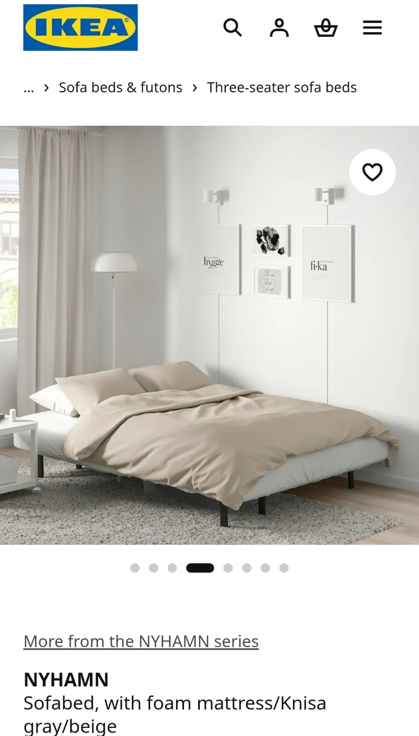 Three-seater sofabed from IKEA's NYHAMN series. Features a foam mattress with a Knisa gray/beige cover. Converts easily from a sofa to a bed, measuring 200 cm (78 3/4") long when unfolded.