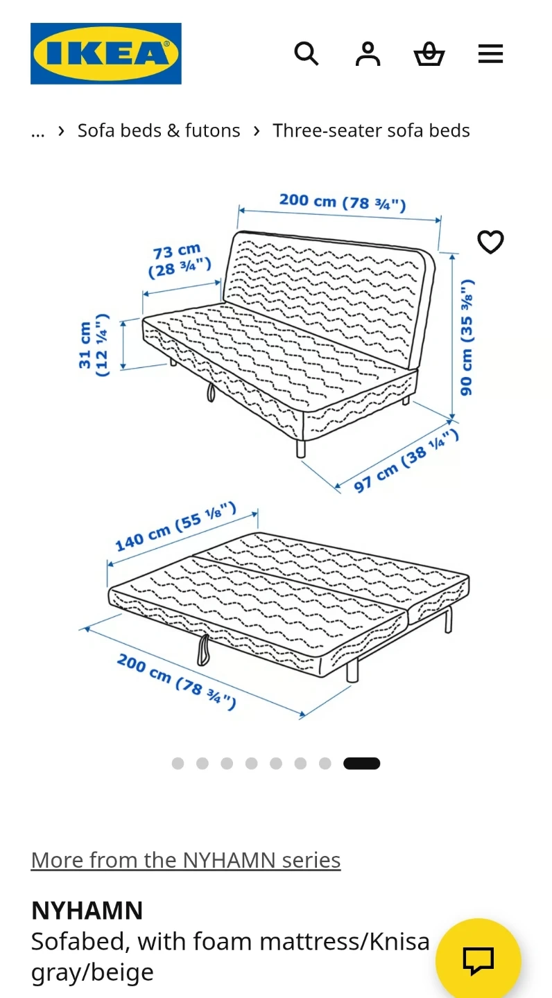Three-seater sofabed from IKEA's NYHAMN series. Features a foam mattress with a Knisa gray/beige cover. Converts easily from a sofa to a bed, measuring 200 cm (78 3/4") long when unfolded.