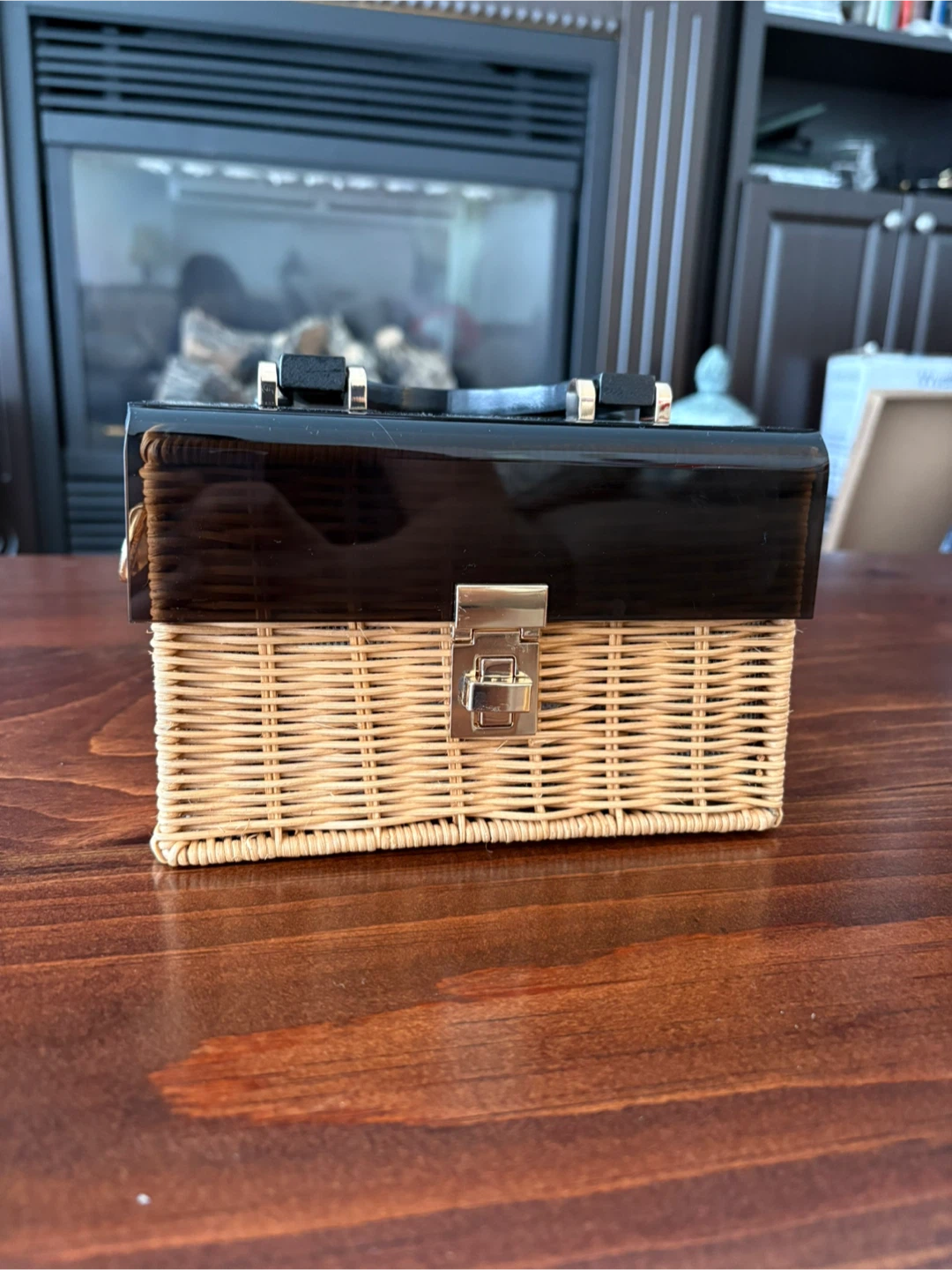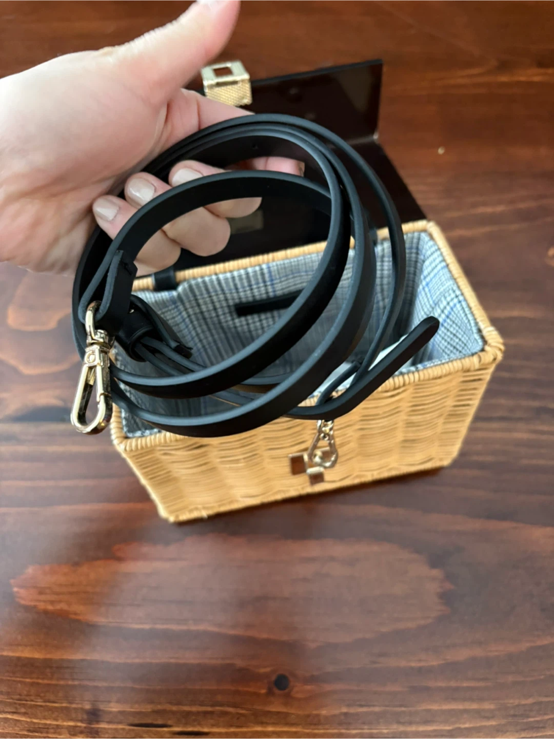 Zara wicker basket bag in good condition. Comes with a detachable black strap so you can wear in shoulder as well. Has a fabric interior lining. Minor scuffs on the buckle and side (see photos) but because its reflective surface it’s not visible when using.