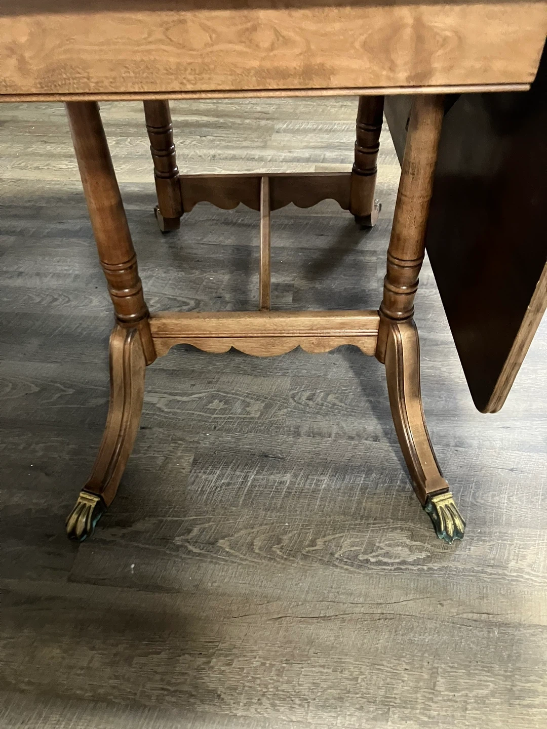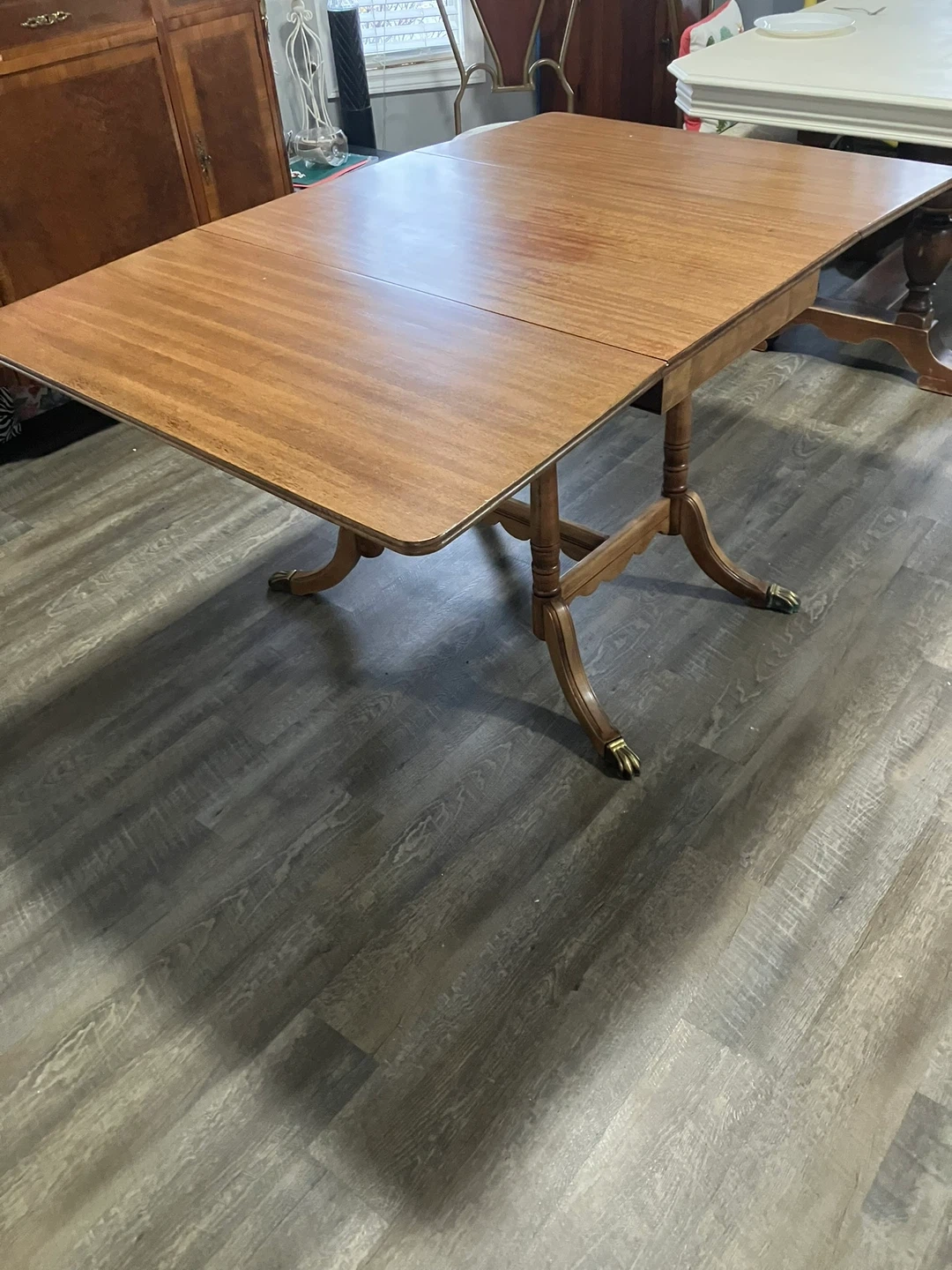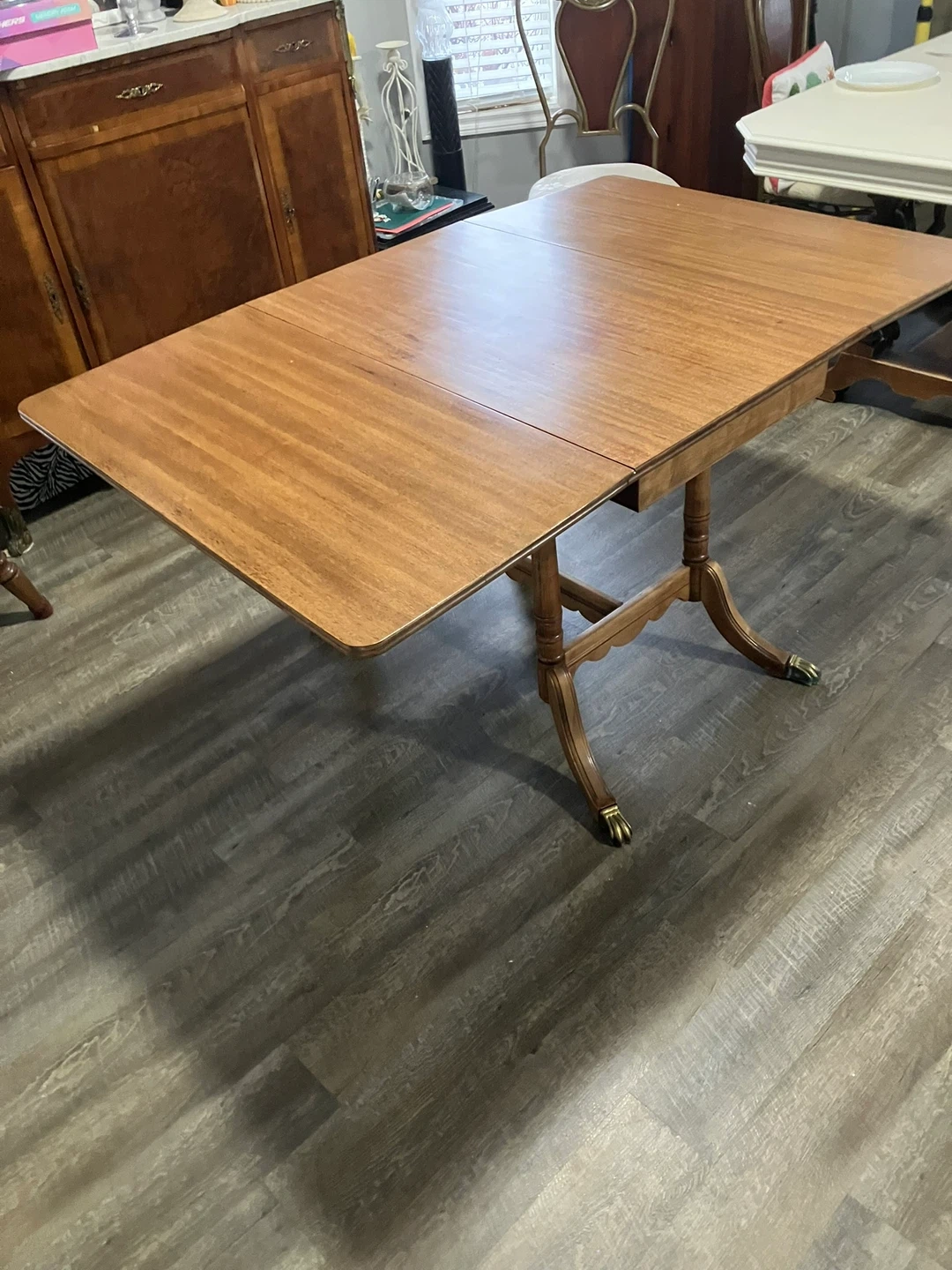 Here's a lovely wooden dining table with an extendable leaf on each side! It's perfect for smaller spaces and can be expanded when you have guests over. The table has a classic design with elegant legs and brass claw feet. It shows some signs of wear, adding to its vintage charm