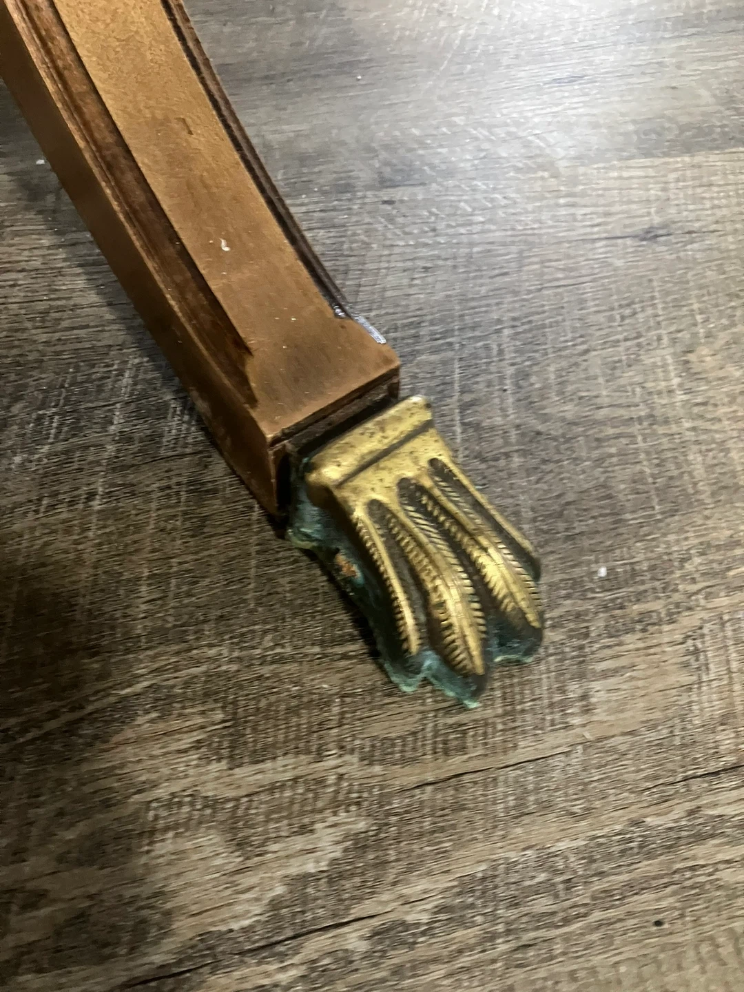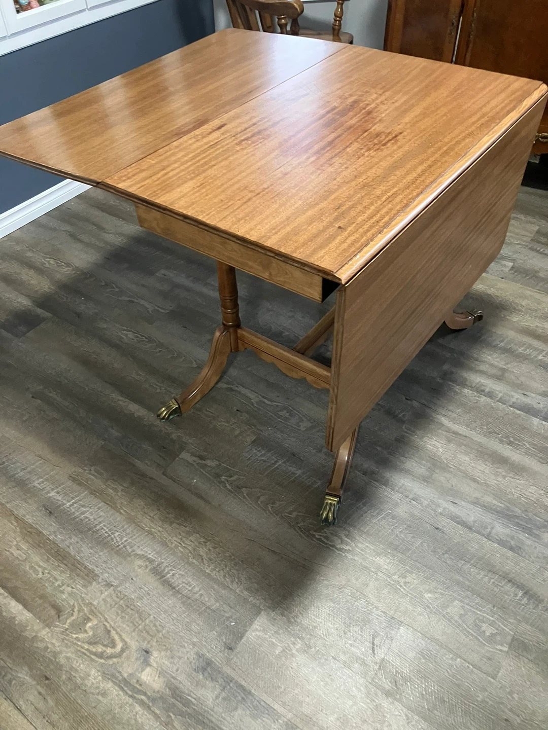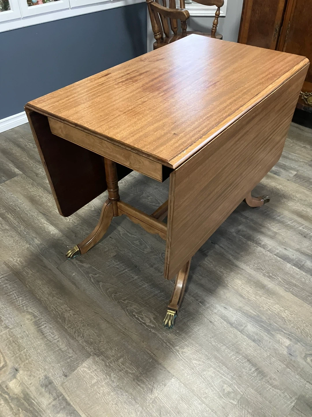 Here's a lovely wooden dining table with an extendable leaf on each side! It's perfect for smaller spaces and can be expanded when you have guests over. The table has a classic design with elegant legs and brass claw feet. It shows some signs of wear, adding to its vintage charm