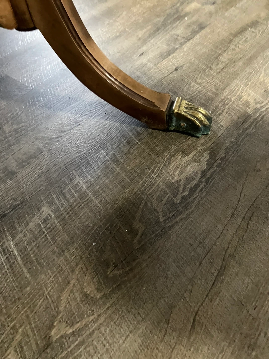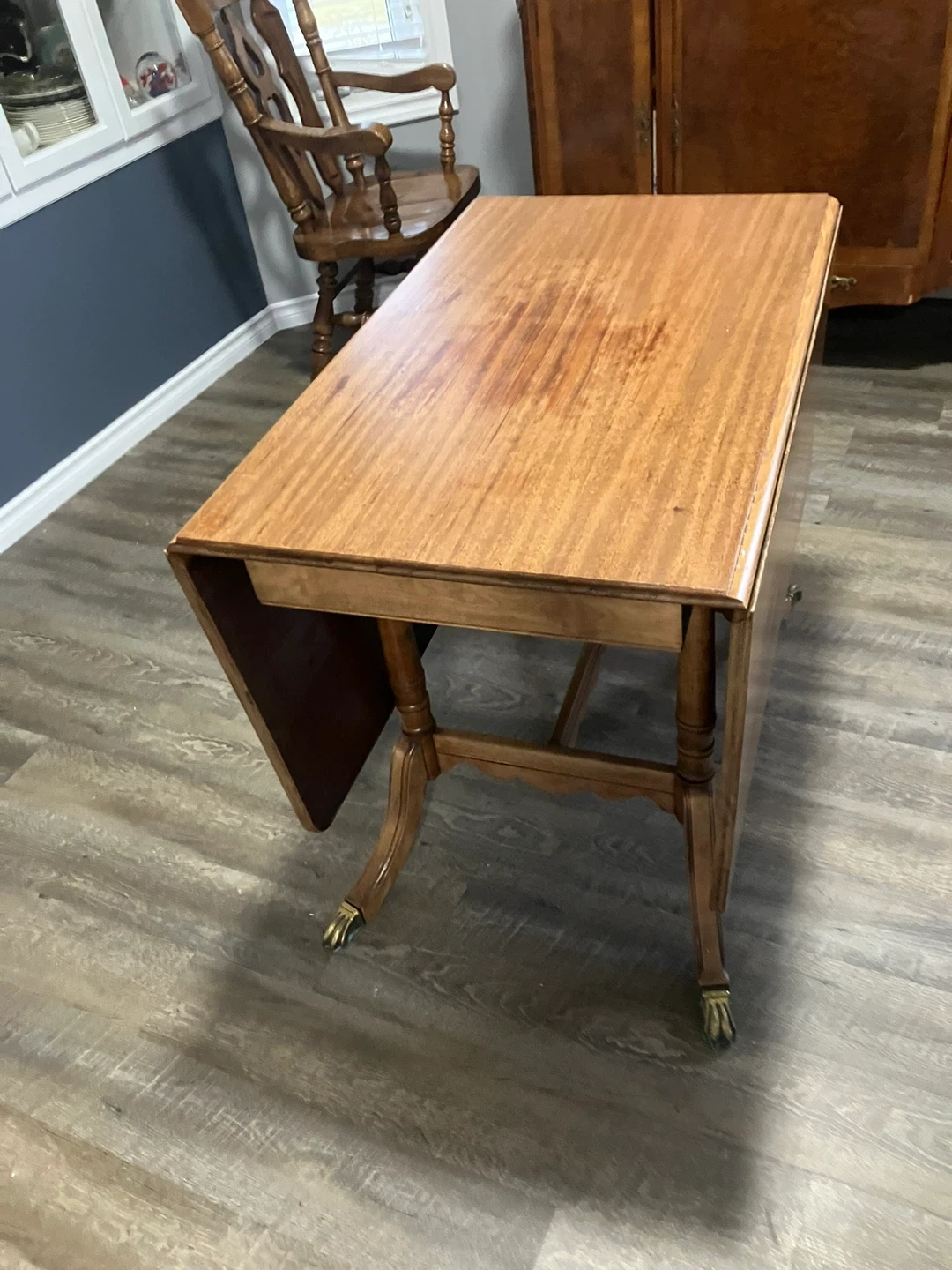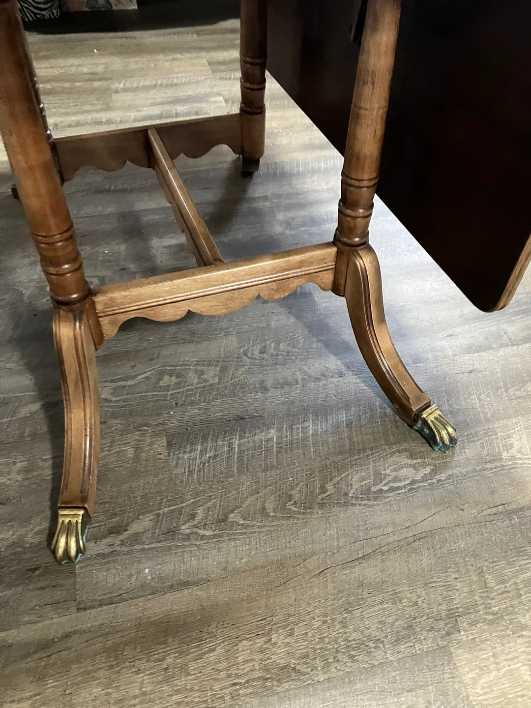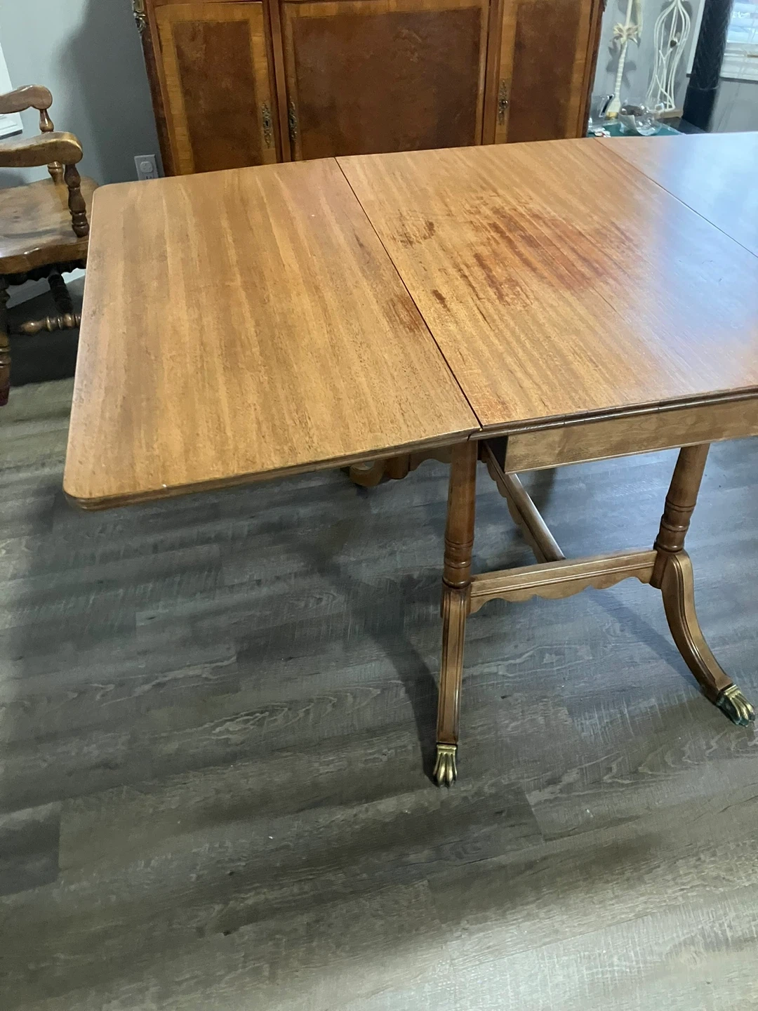 Here's a lovely wooden dining table with an extendable leaf on each side! It's perfect for smaller spaces and can be expanded when you have guests over. The table has a classic design with elegant legs and brass claw feet. It shows some signs of wear, adding to its vintage charm