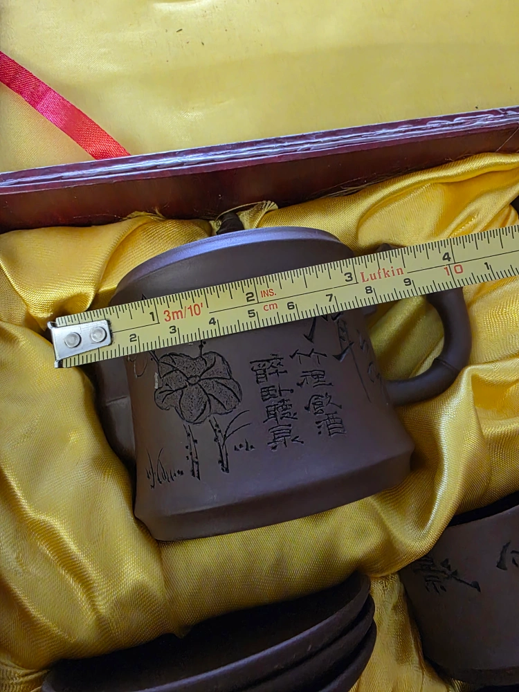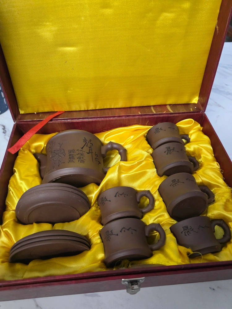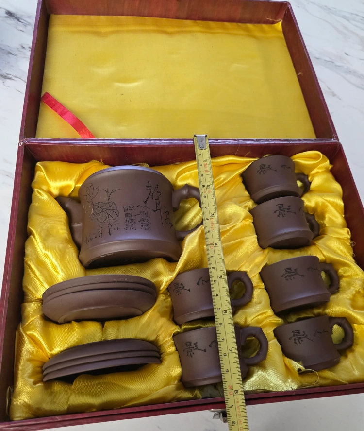 Lovely tea set, complete with a teapot and small cups. There are also saucers. This set would be the perfect addition to any Chinese tea lover's collection.