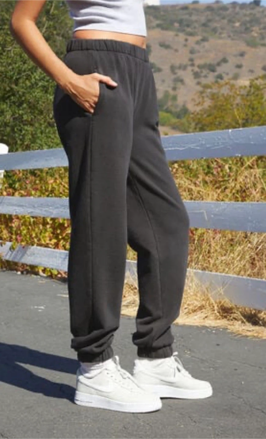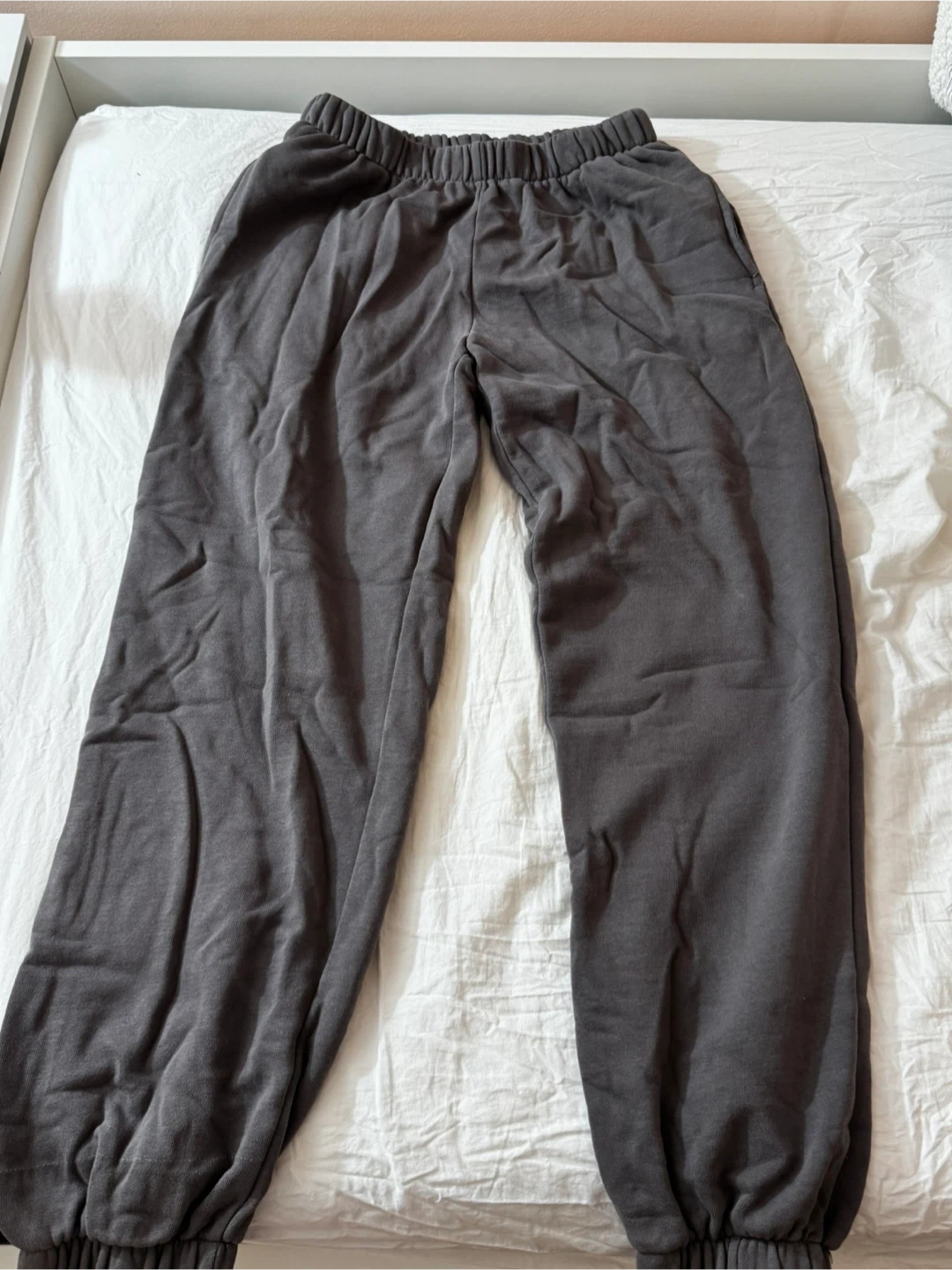 Comfy grey sweatpants with an elastic waistband and cuffs. These pants are made from a soft material, perfect for lounging or casual wear. They feature side pockets for convenience.