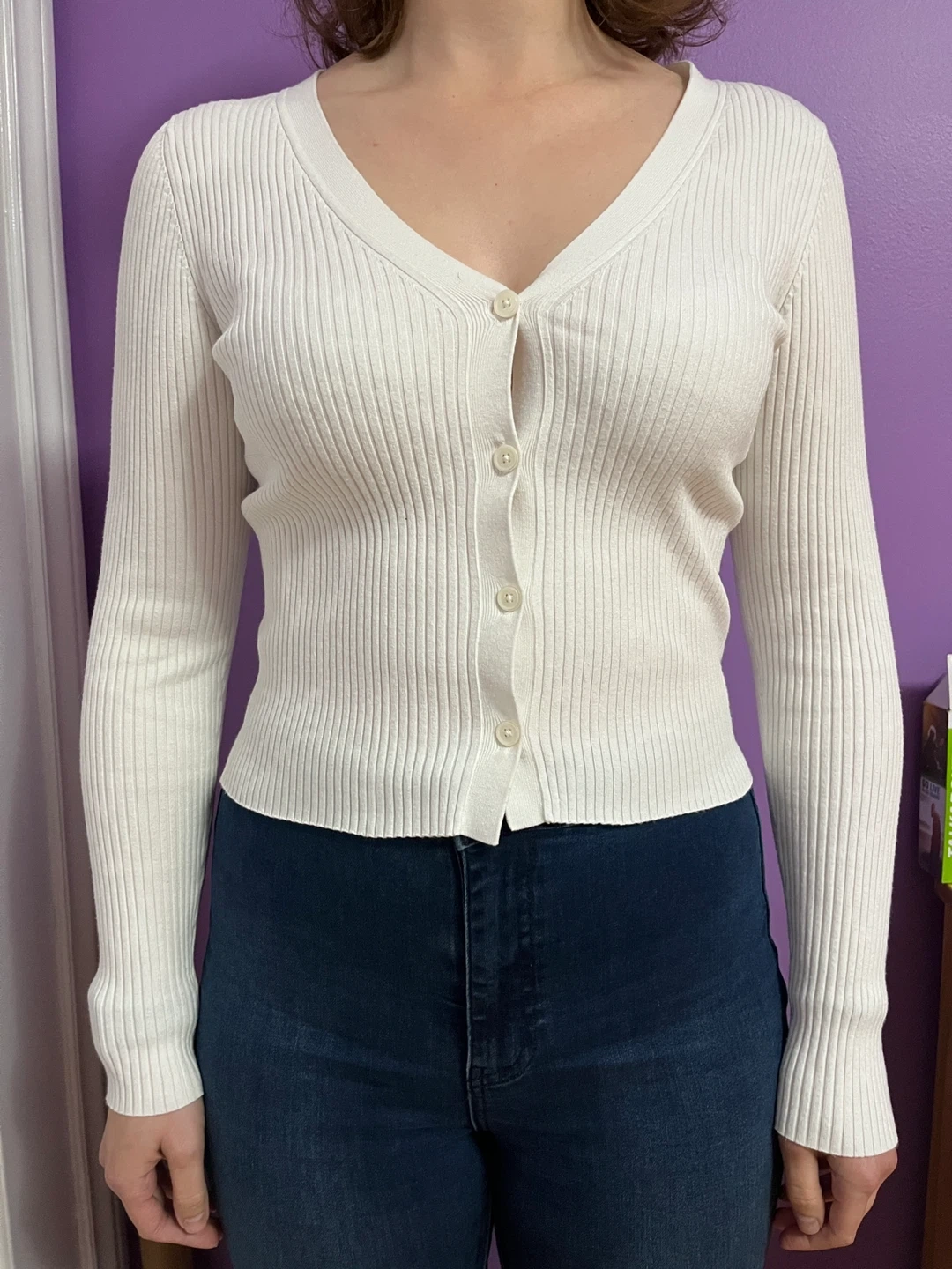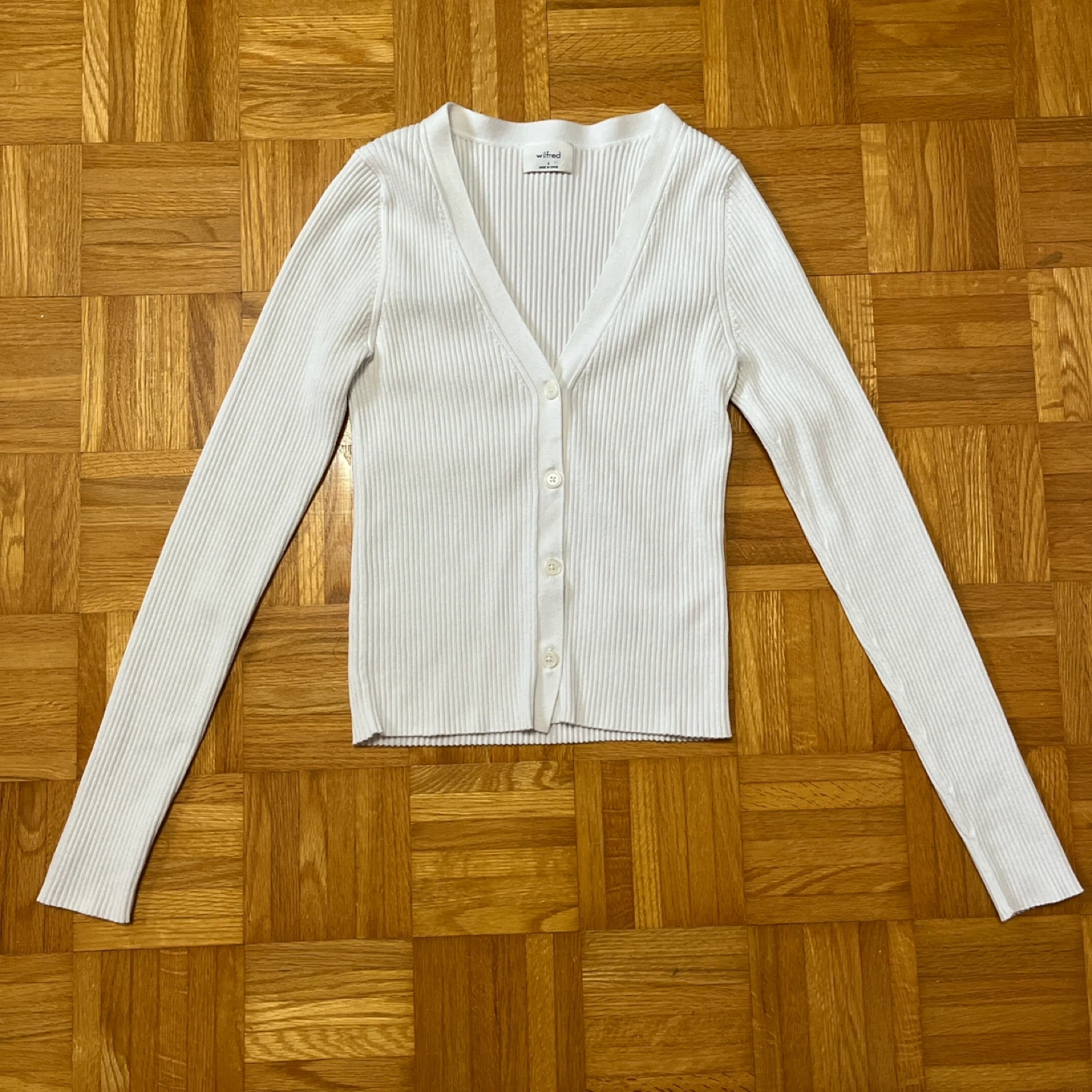 Aritzia Wilfred white button-up ribbed cardigan.