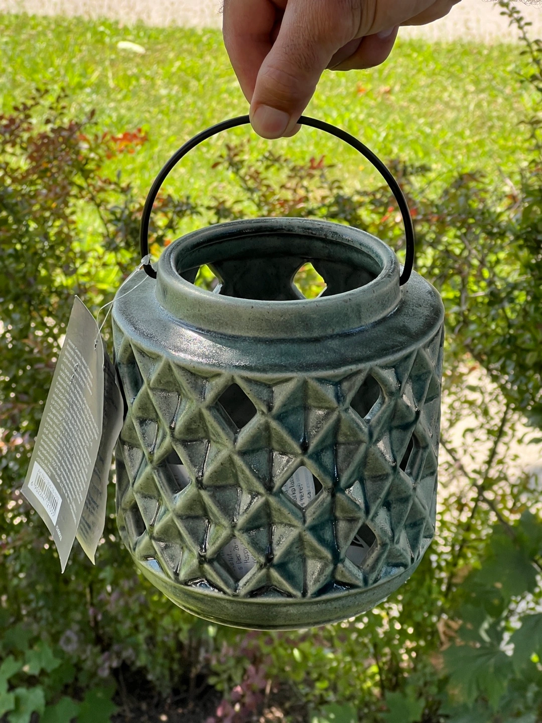 Selling a lovely green ceramic lantern! It has a unique geometric design and a metal handle. Perfect for adding a cozy touch to any room or outdoor space