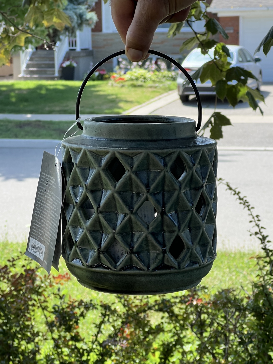 Selling a lovely green ceramic lantern! It has a unique geometric design and a metal handle. Perfect for adding a cozy touch to any room or outdoor space