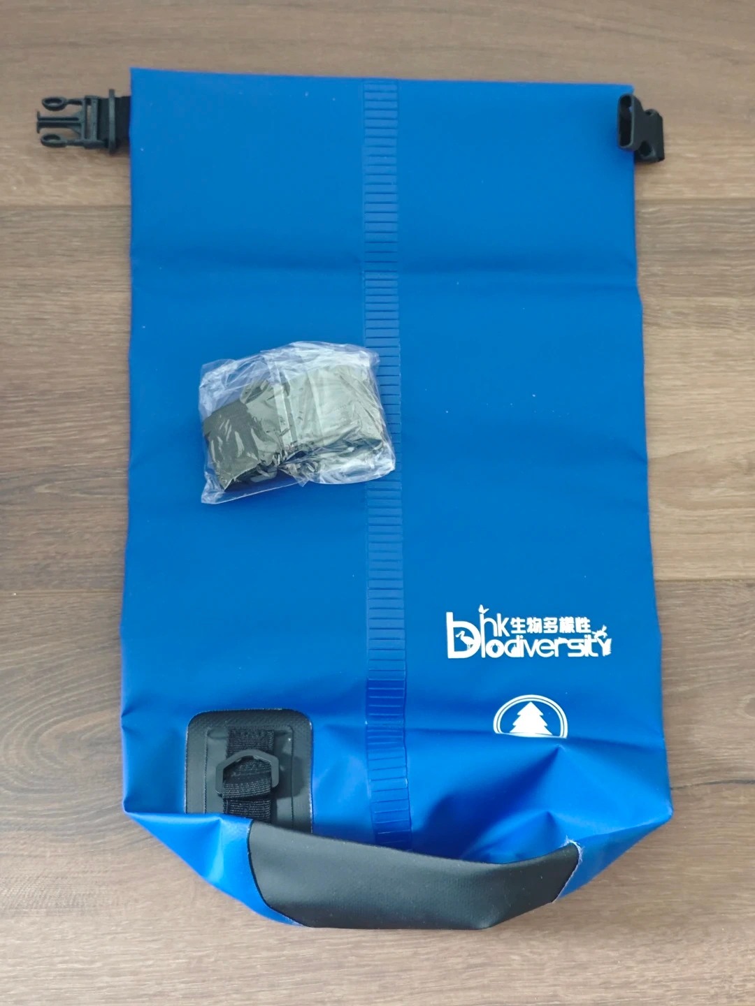 A blue dry bag designed to protect your gear from water. It features a "Protect Our Oceans" motif. This bag is suitable for outdoor activities where keeping items dry is important. It comes with a strap for carrying.
