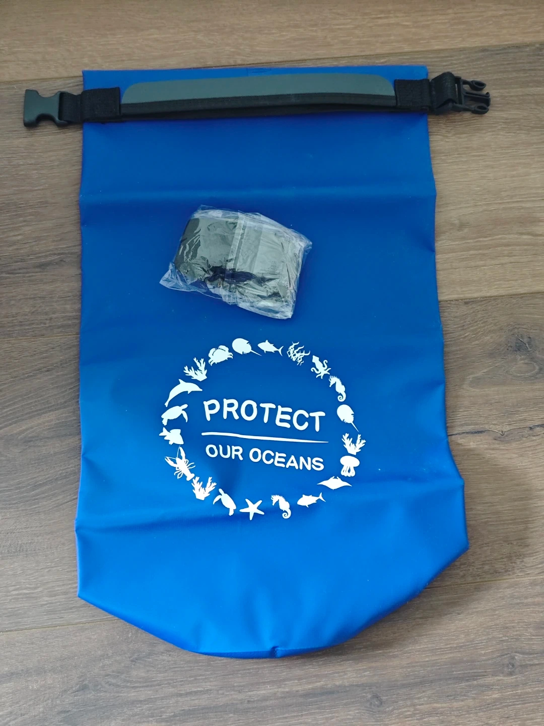 A blue dry bag designed to protect your gear from water. It features a "Protect Our Oceans" motif. This bag is suitable for outdoor activities where keeping items dry is important. It comes with a strap for carrying.