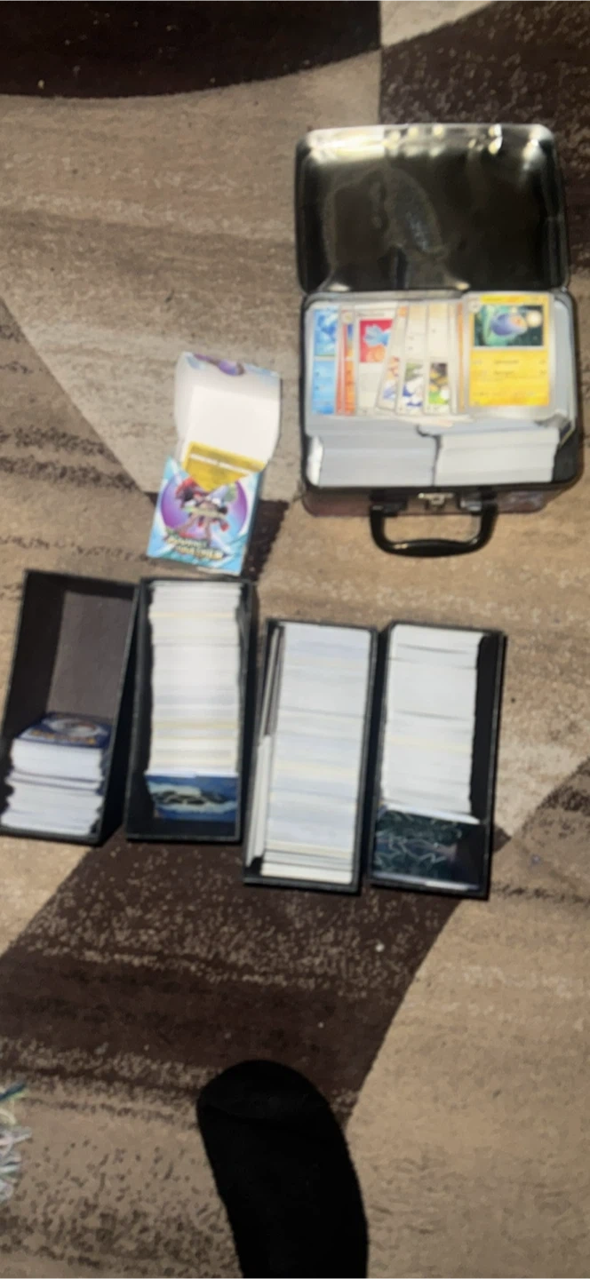 Selling a collection of Pokémon cards. It includes a storage tin full of cards and several card boxes. Hollows, reverse rares and commons over 3000 cards