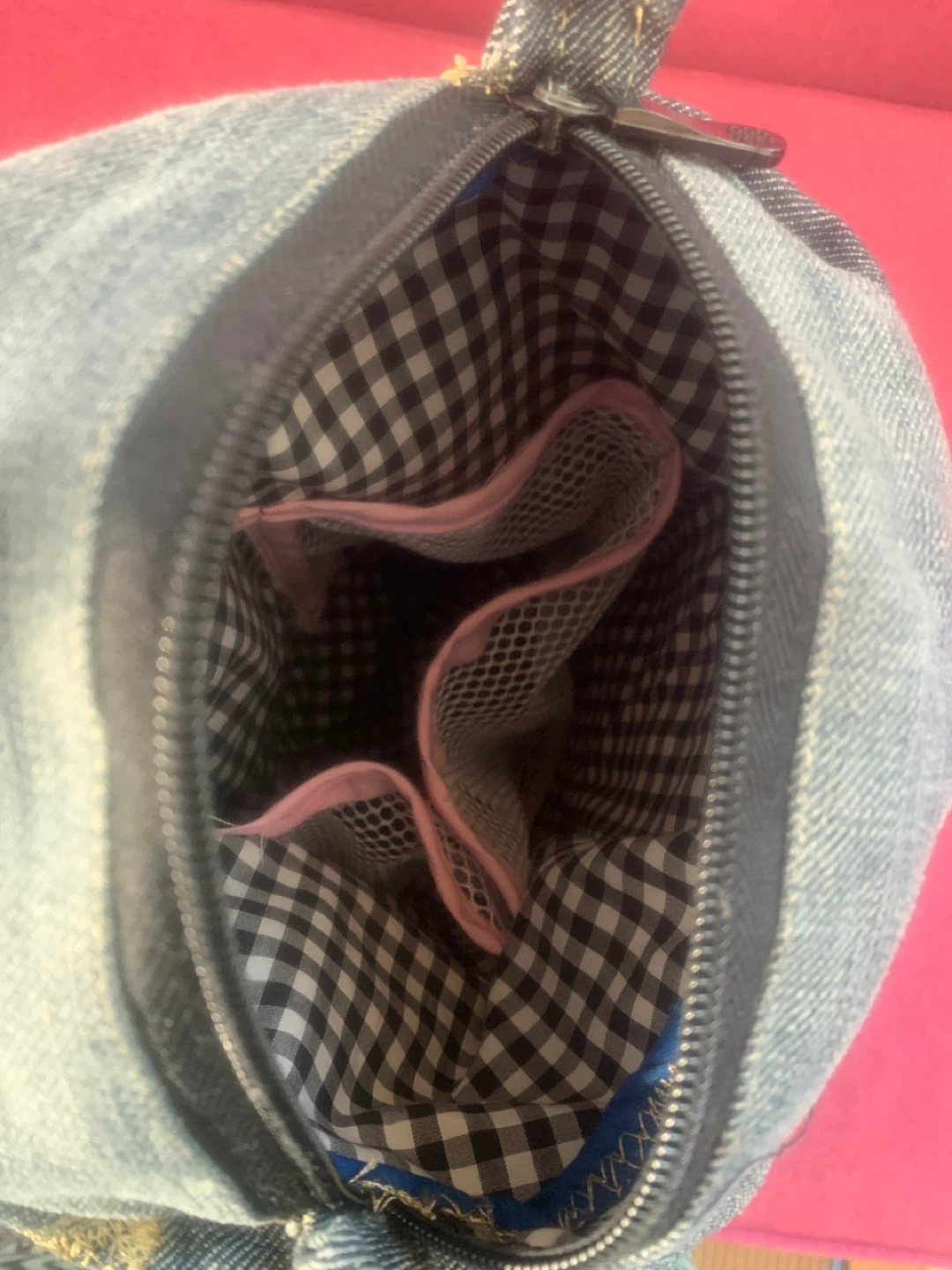 This is one of a kind unique denim patchwork backpack with embroidered gold cord. It has a front pocket that can fit a phone.