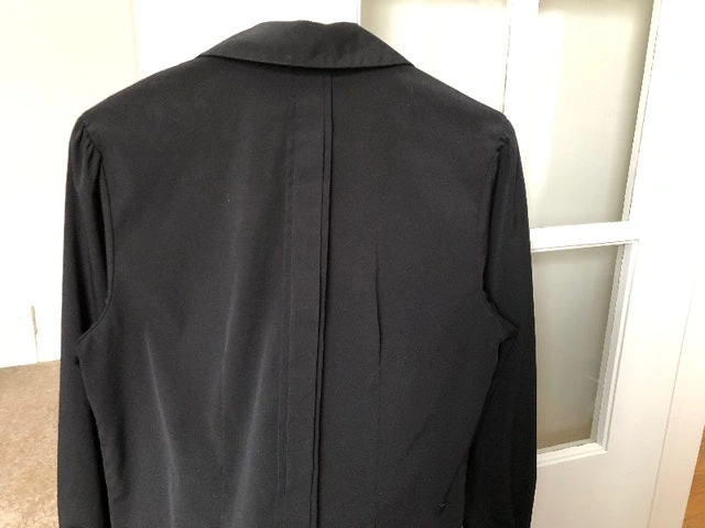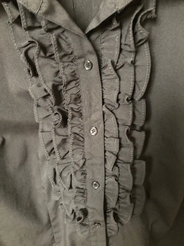 Long sleeved, buttons down front, black blouse, ruffled. Has a unique small strip of double pleated material on back. Poly-spandex creates a little stretch to material. Machine washable. Gently used, in good shape. Brampton, near Queen and Kennedy.