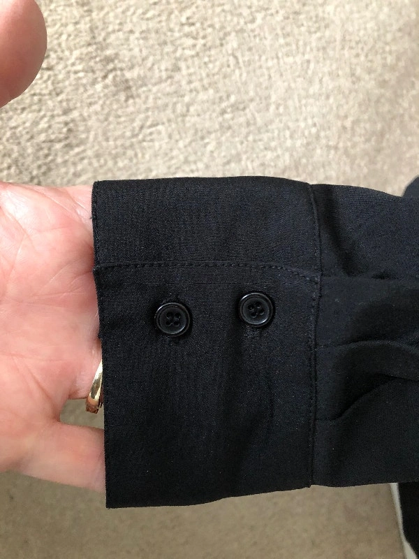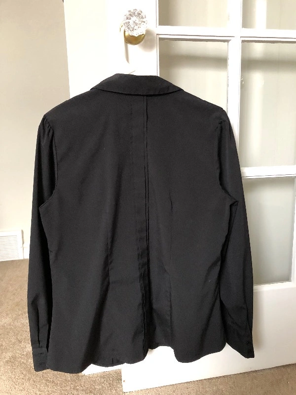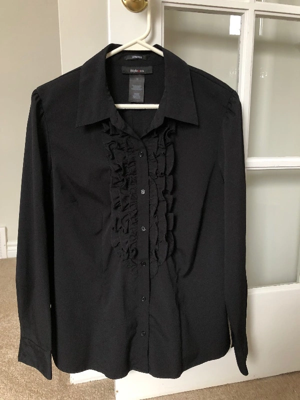 Long sleeved, buttons down front, black blouse, ruffled. Has a unique small strip of double pleated material on back. Poly-spandex creates a little stretch to material. Machine washable. Gently used, in good shape. Brampton, near Queen and Kennedy.