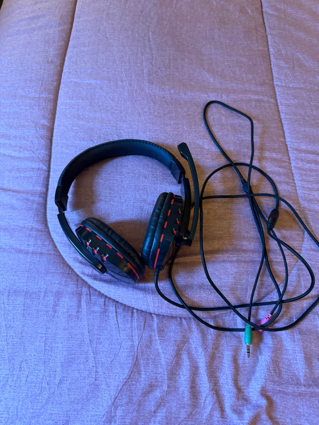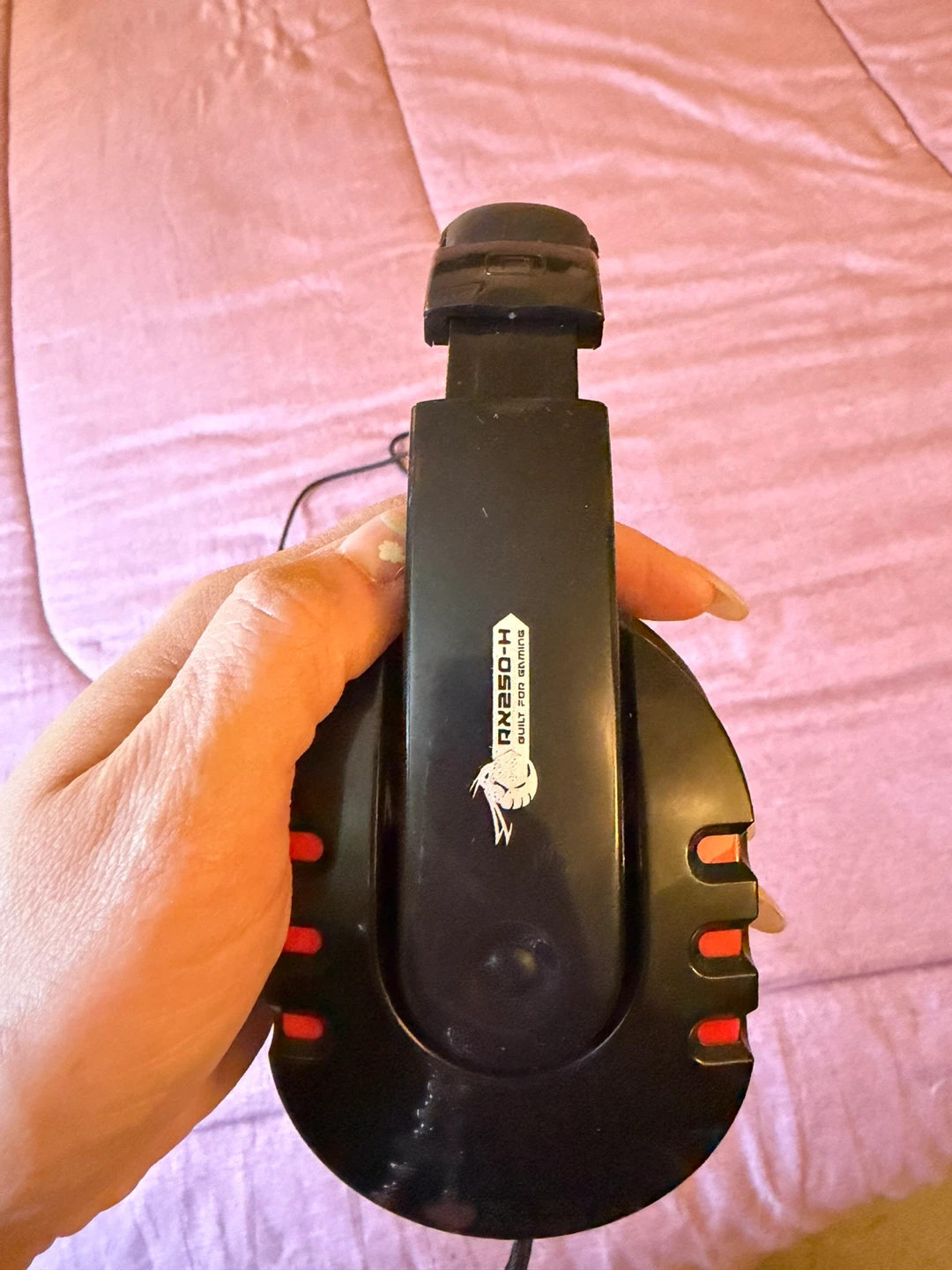 This is a set of RX250-H gaming headphones. They feature a built-in microphone and red accents. The earcups are padded for comfort. These headphones are built for gaming!