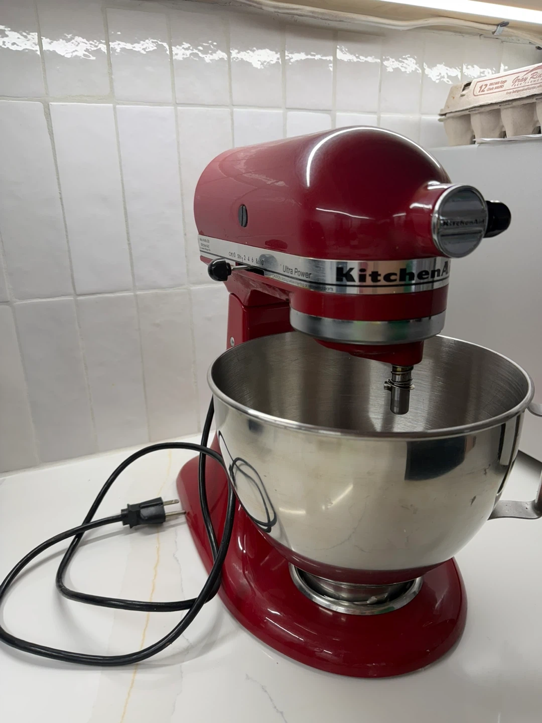 Red KitchenAid Ultra Power stand mixer with stainless steel bowl. This mixer has multiple speed settings. It's a classic kitchen essential for baking and cooking! (It doesn't bring more accessories, it only has the bowl)