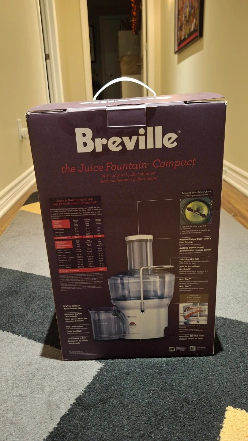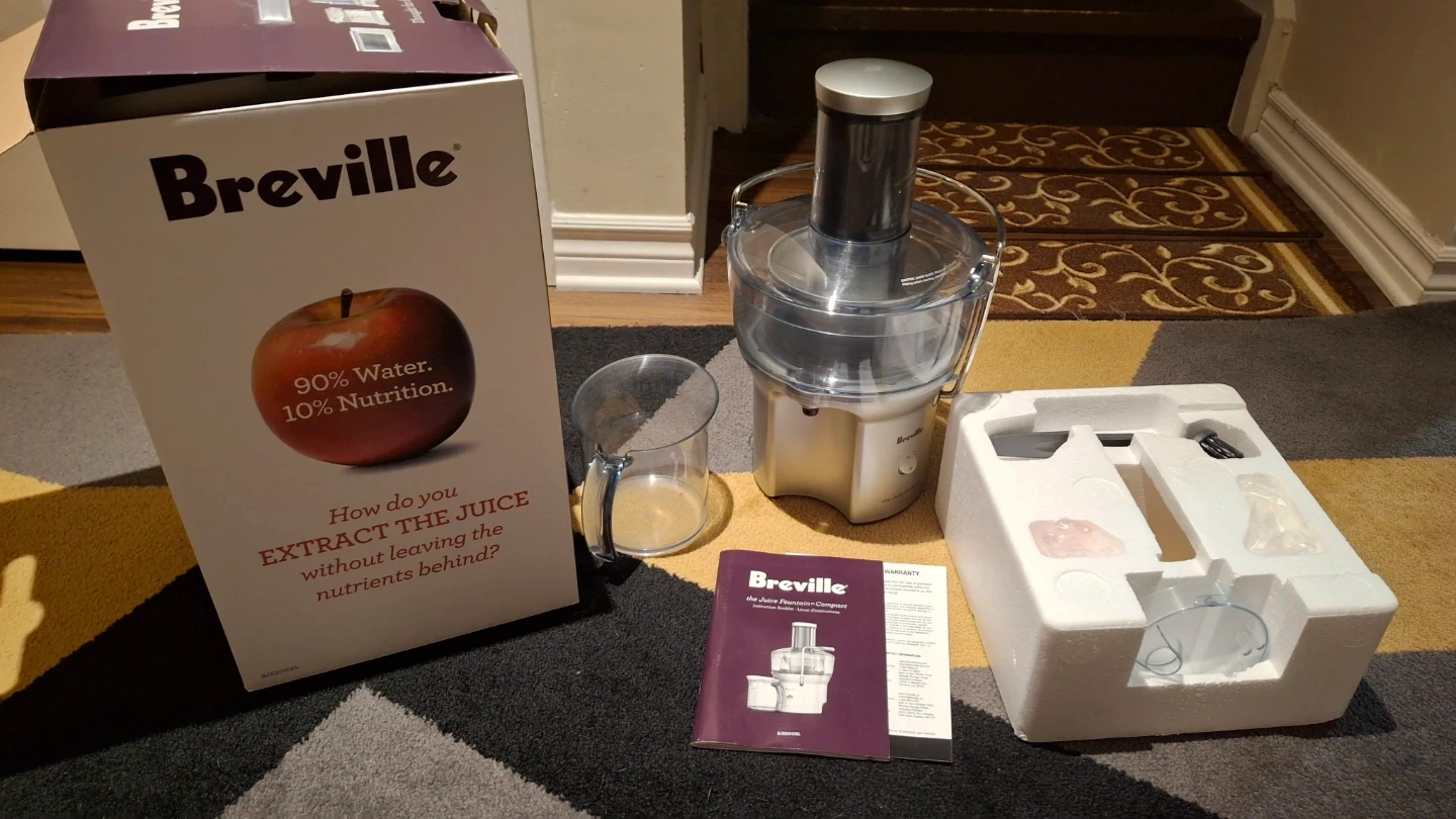 Breville Juice Fountain Compact juicer. It's silver and comes with the original box and manual. Juicer has a wide chute for large fruits and vegetables.