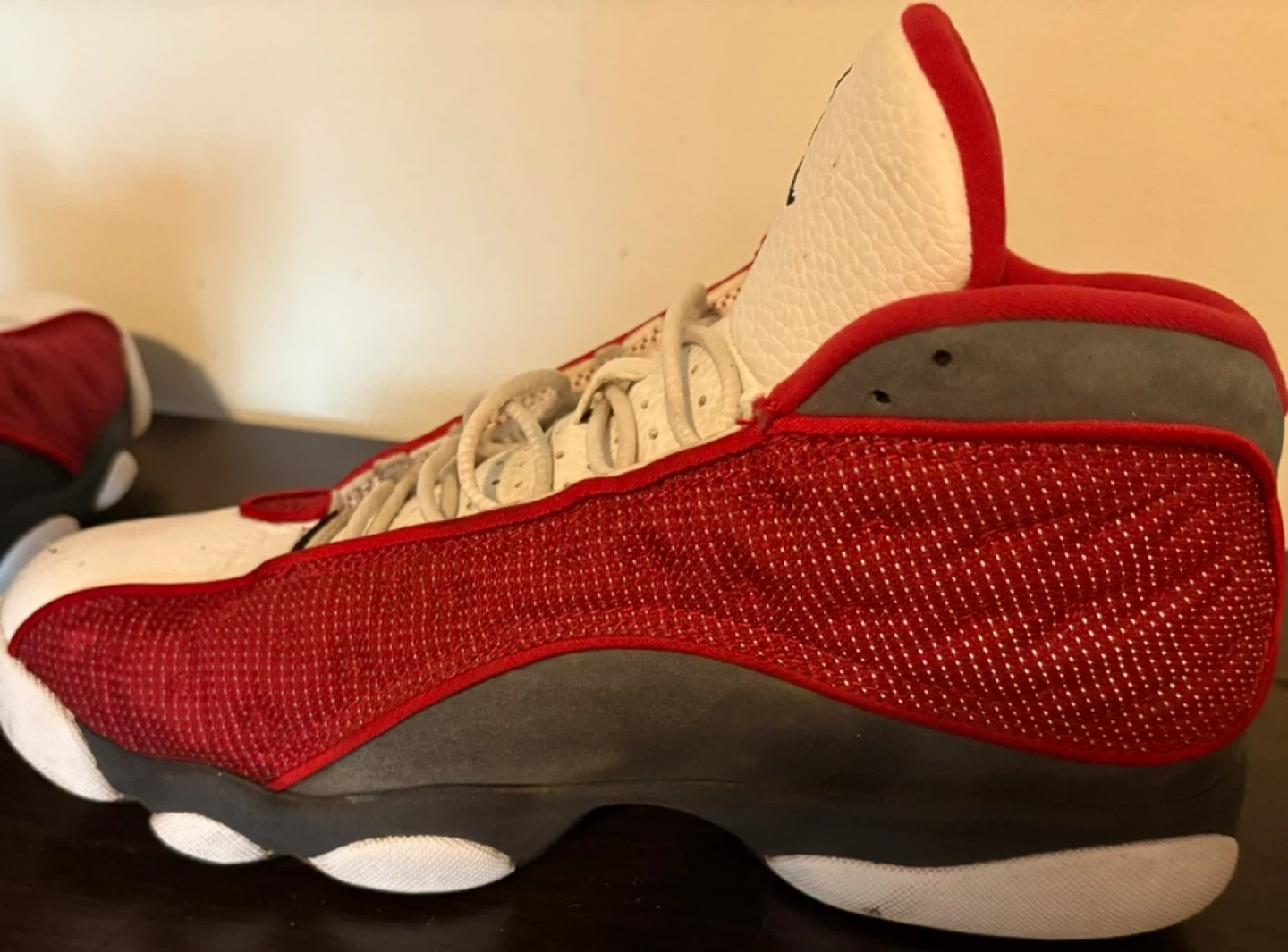 Men's Air Jordan 13 basketball shoes in a red and white colourway. Features a signature Jumpman logo on the tongue. These kicks are great for hitting the court or just for everyday wear! Small scuff on the toe of one good shoes still just seeing if there is any interest in them