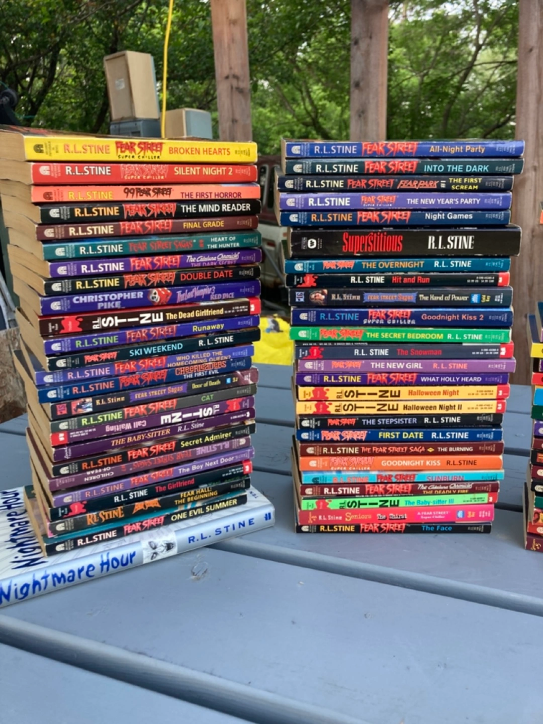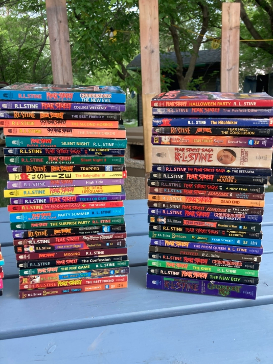 An amazing collection of Fear Street and other RL Stine books, great for anyone who enjoys thrilling reads. Features a variety of titles and colourful spines, perfect for any bookshelf. Books are in varying conditions. Reading a book like this is a great way to spend a rainy afternoon.