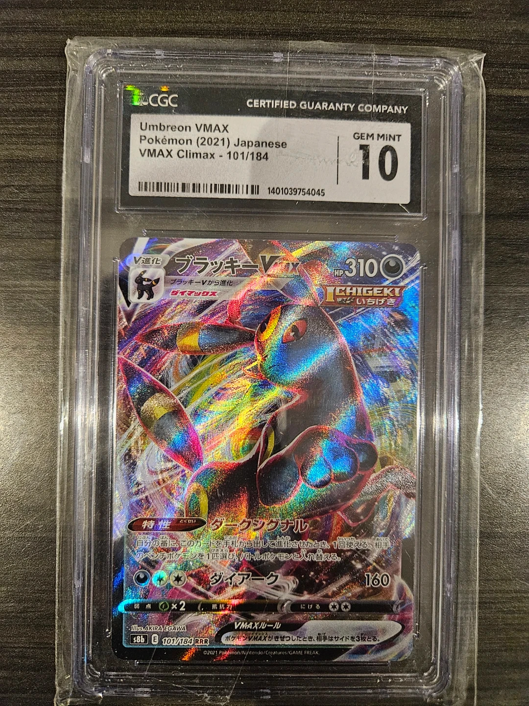This is a graded Umbreon VMAX Pokémon card from the 2021 Japanese VMAX Climax set. It's graded GEM MINT 10 by CGC. It features the "Dark Signal" ability and "Dark Pulse" attack. SHIPPING ONLY