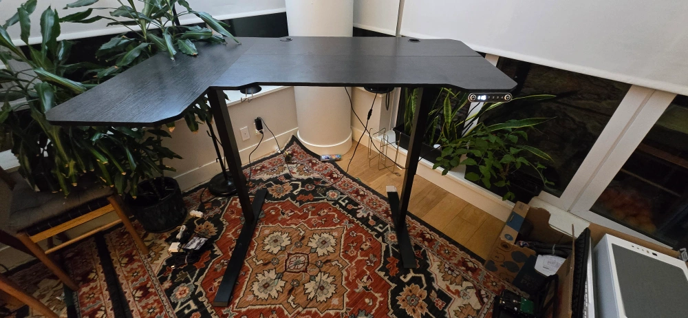 Selling a gently used L-shaped height-adjustable desk in excellent working condition. Perfect for a home office or professional workspace. The spacious corner design easily fits dual monitors, a laptop, a keyboard, and accessories.