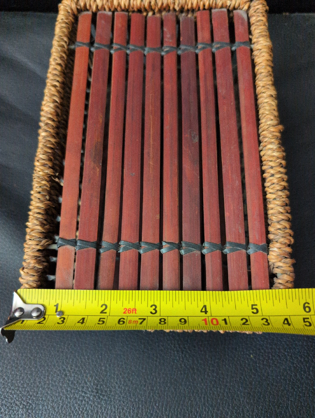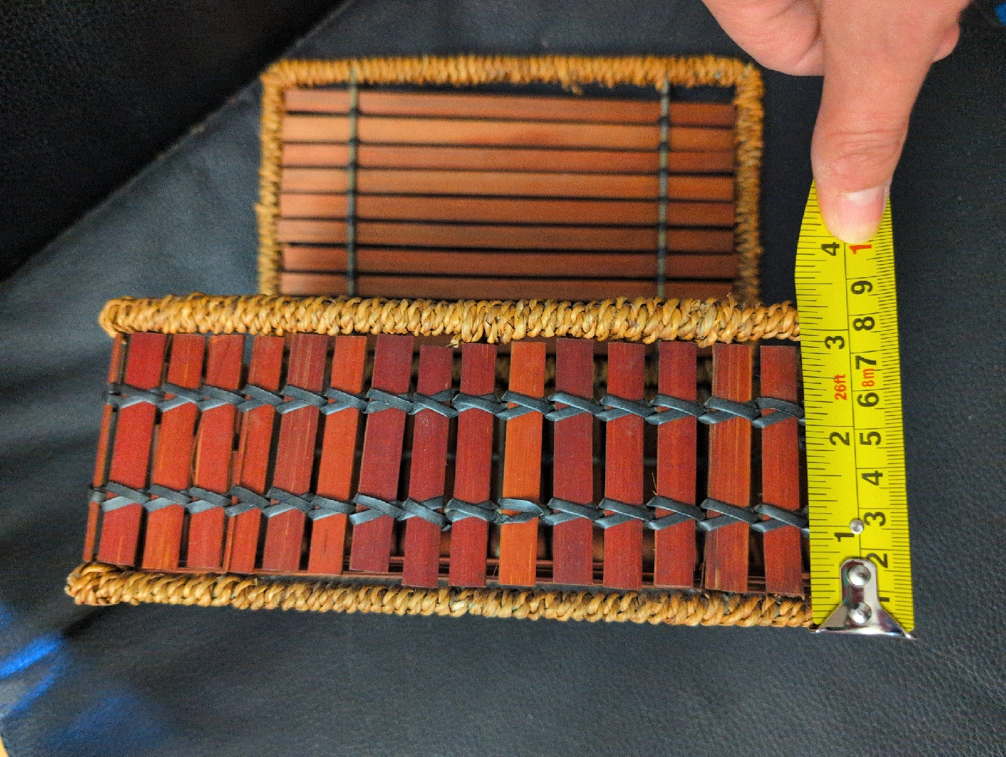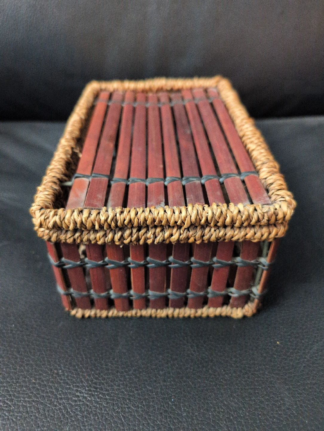 Woven bamboo storage box! It's in great shape and perfect for organizing small items around the house. The dimensions are approximately 8 inches by 6 inches.