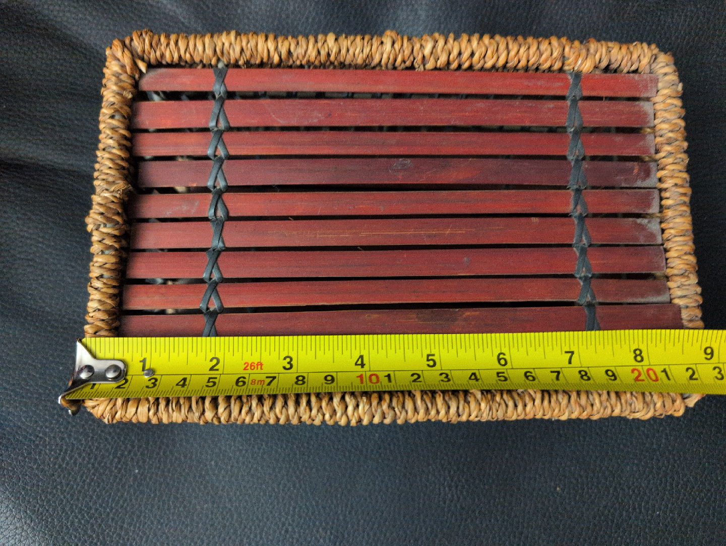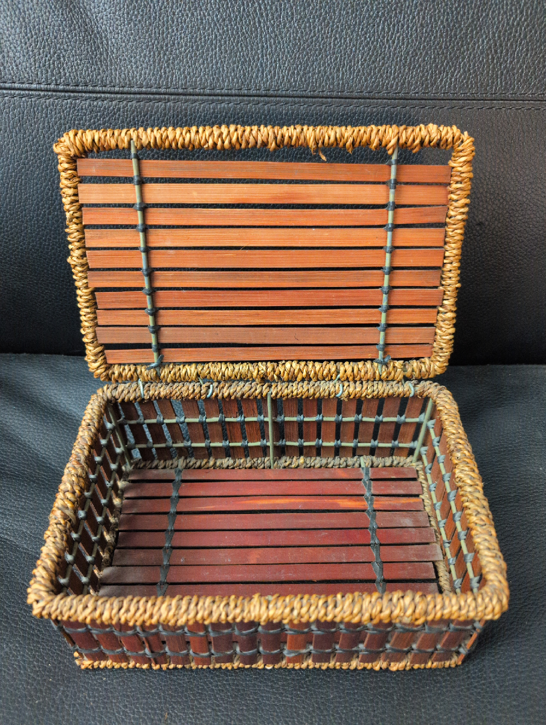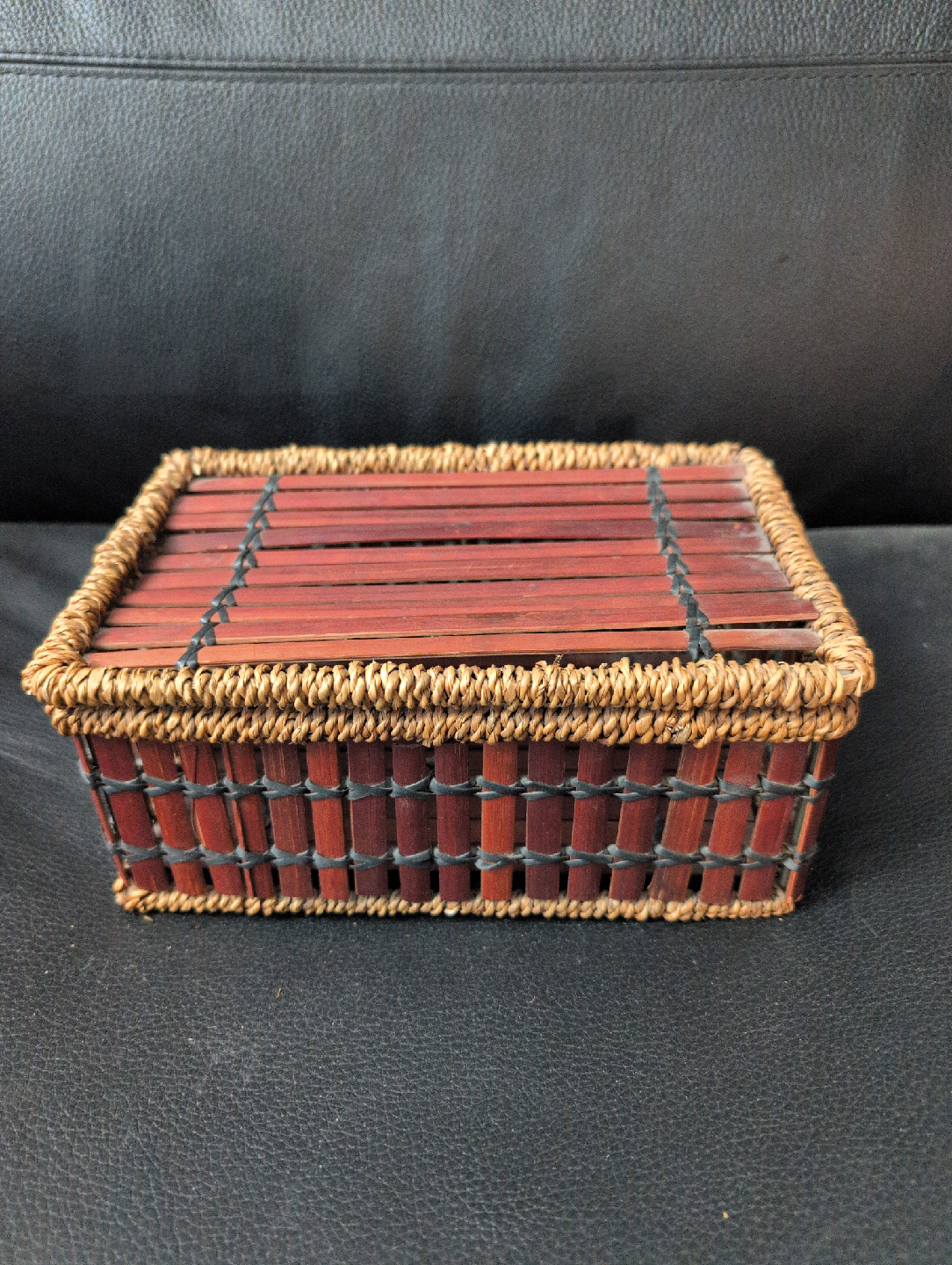 Woven bamboo storage box! It's in great shape and perfect for organizing small items around the house. The dimensions are approximately 8 inches by 6 inches.