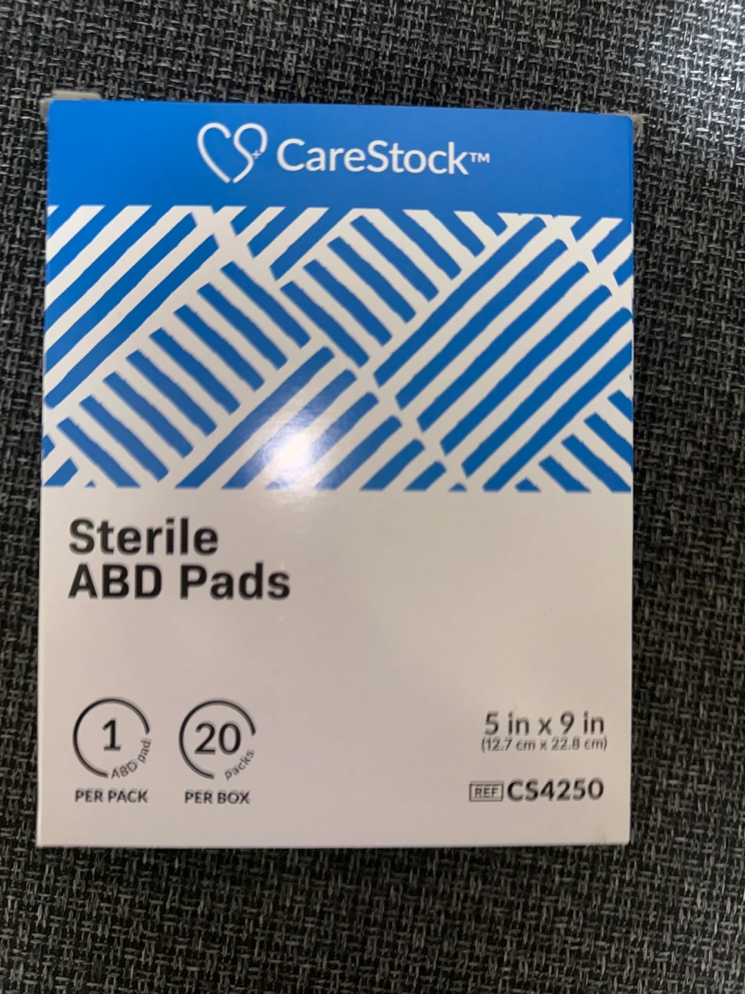 CareStock sterile ABD pads, measuring 5 by 9 inches. There are 20 packs included, with one ABD pad per pack. These are medical absorbent dressings.