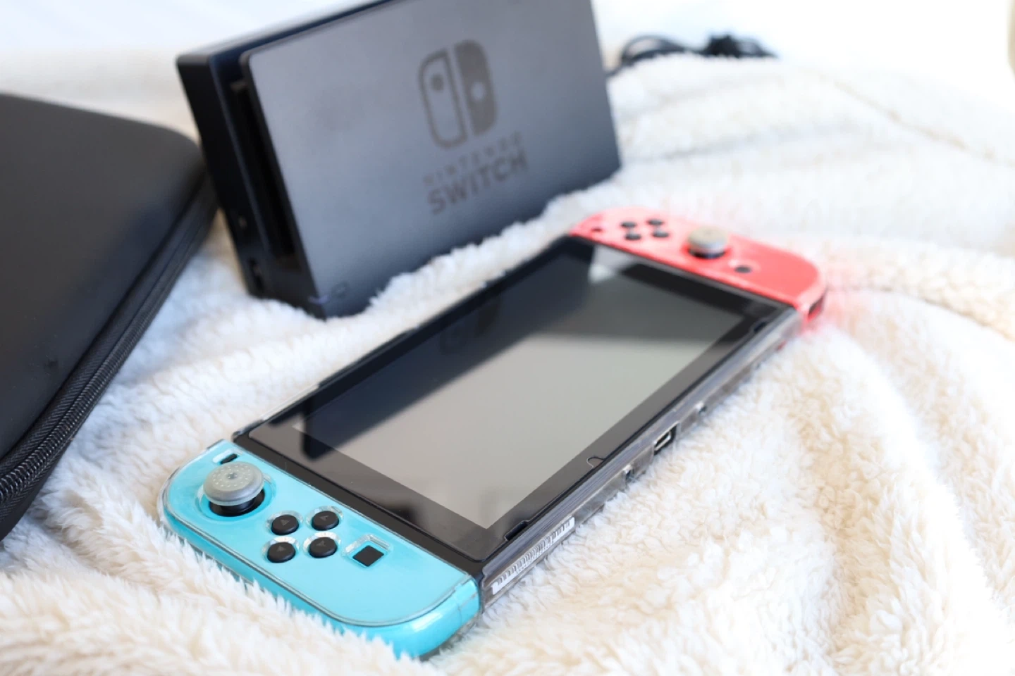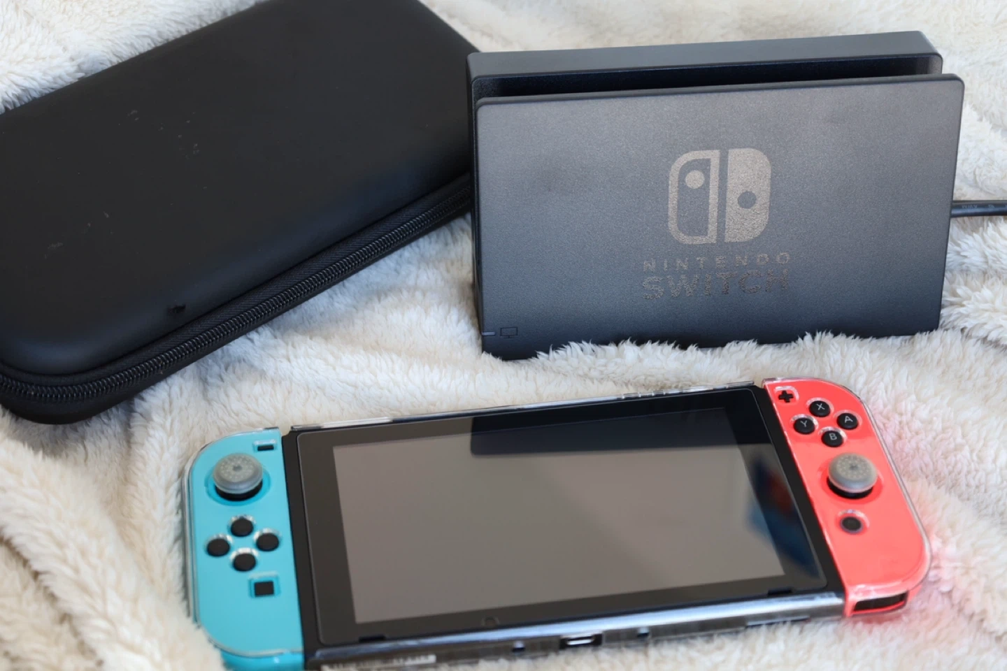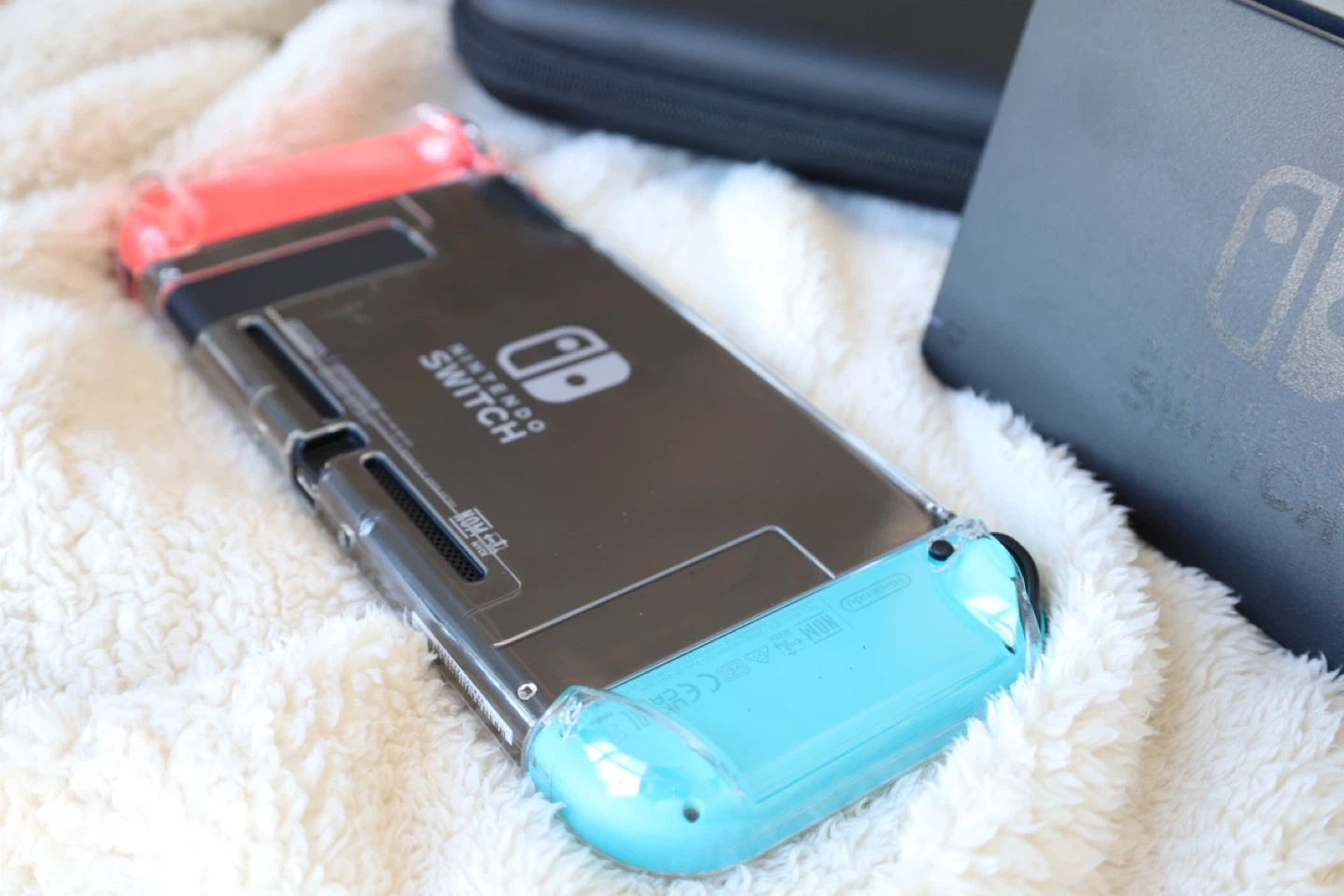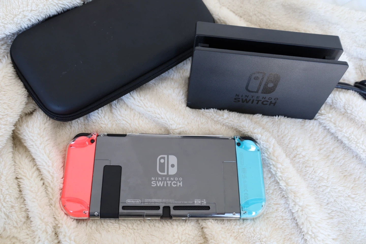 Nintendo Switch gaming console in grey with neon red and blue Joy-Cons. Includes the dock and a black carrying case. Great for gaming on the go or at home!
