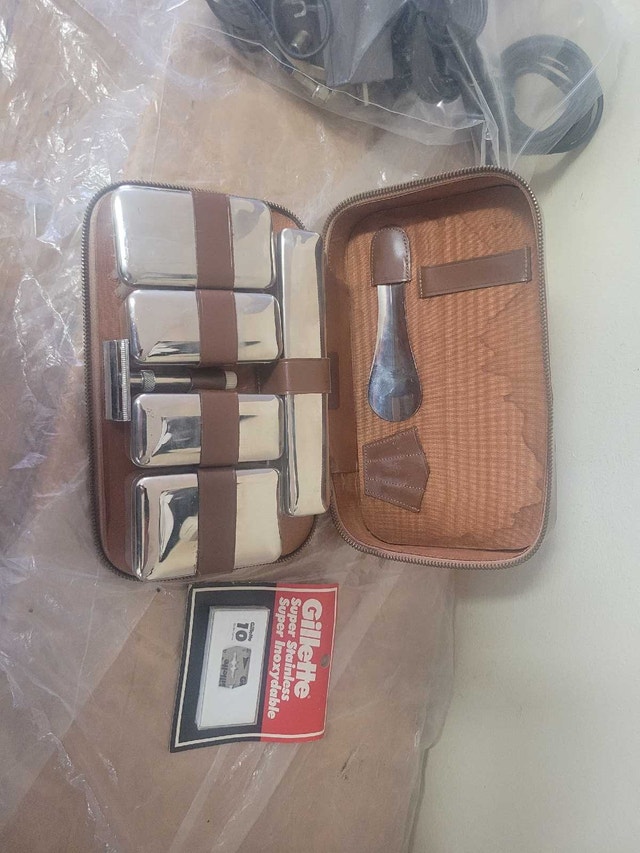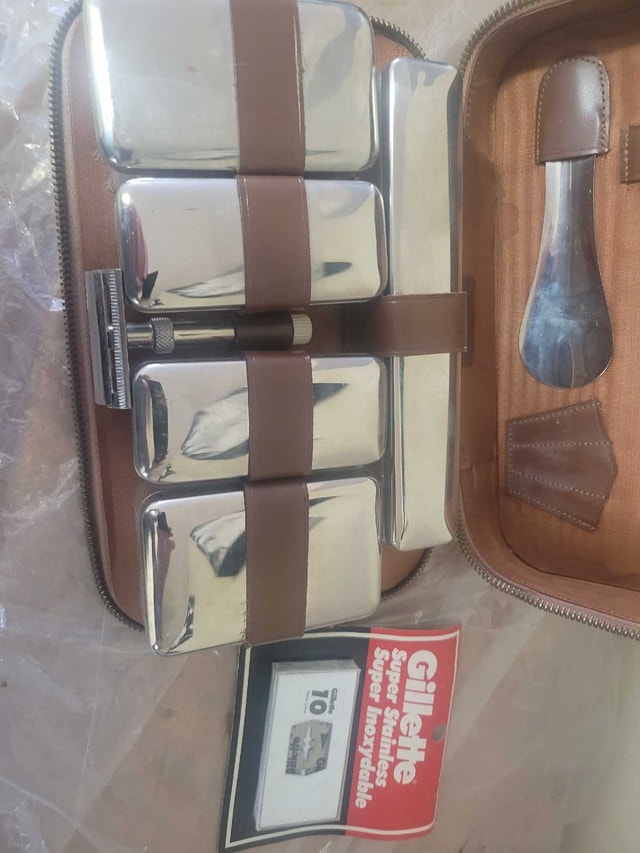 For sell is this Vintage Mens Travel Grooming Kit Vanity Case Set in Leather Brown Zipper Case. There is a few pieces missing comb and nail kit . The rest of the set is new including a pack of new razor blades asking $30 pick up on beaverbrook lane Kanata thank you