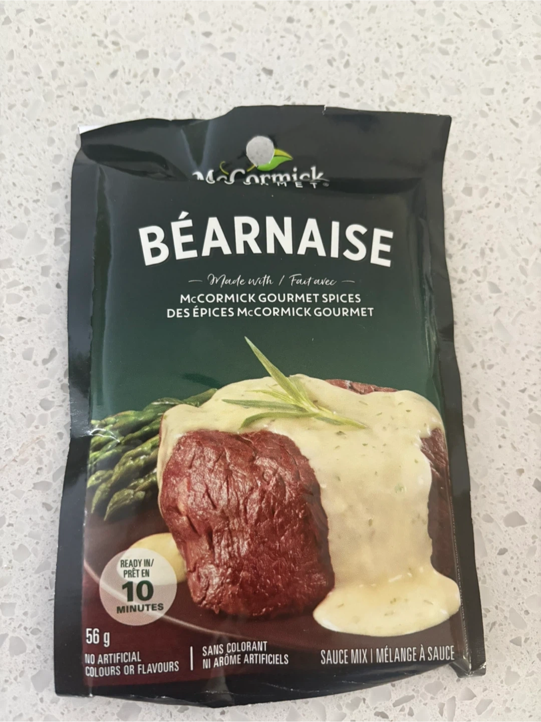 Selling McCormick Béarnaise sauce mix. It's a sauce mix made with McCormick gourmet spices. Ready in 10 minutes. No artificial colours or flavours. Sauce mix / mélange a sauce
