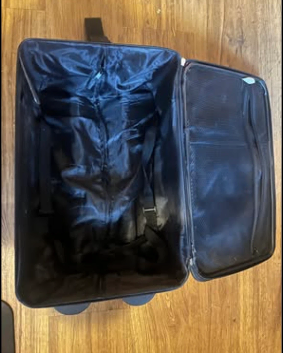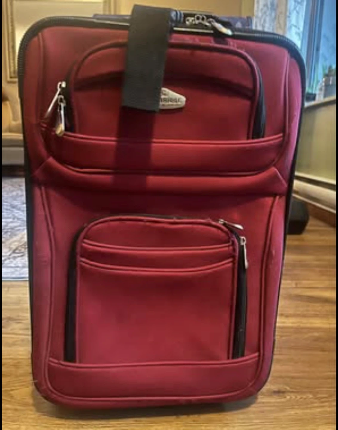 This is a red carry-on suitcase with multiple zippered pockets on the exterior. It's mostly empty inside, showing a fabric lining and straps. It's suitable for weekend trips or as a carry-on for flights. good shape dimensions-12 wide, 7 inch depth, 20 inches high.