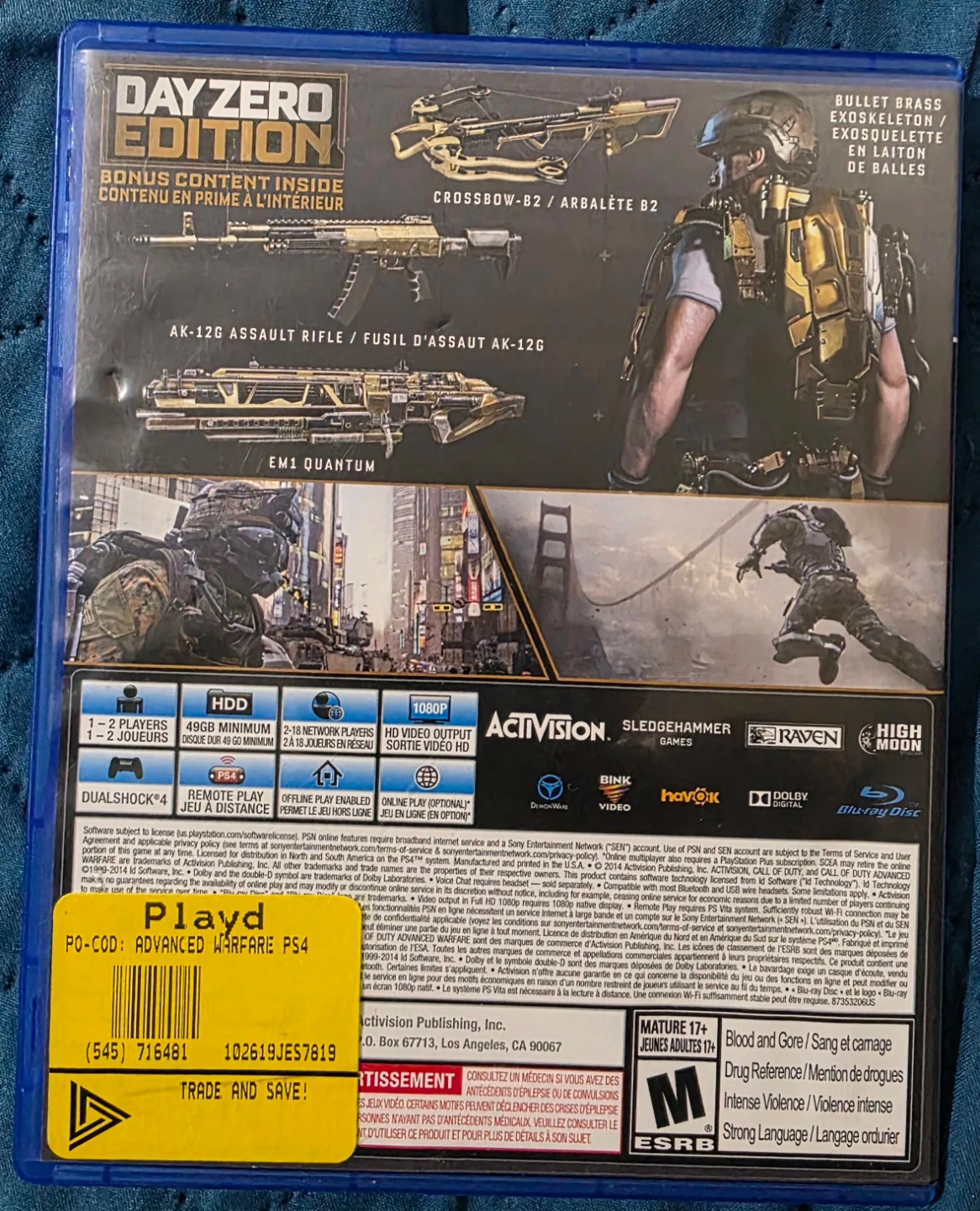 Buy & SellCall Of Duty Advanced Warfare PS4Call Of Duty Advanced Warfare PS4$10Works with now issues. $10 Pickup only in Scarborough around Kennedy and DanforthConditionLike newWHERE TO MEETCheck LocationView MapSELLERverifiedRobBirchcliffe22915 reviews0 chats·0 favorites·10 viewsSEND CHAT TO SELLERHi Rob! I’m interested in your listing.Hi Rob! I’m interested in your listing.Get the Karrot app to chatSign In to chat