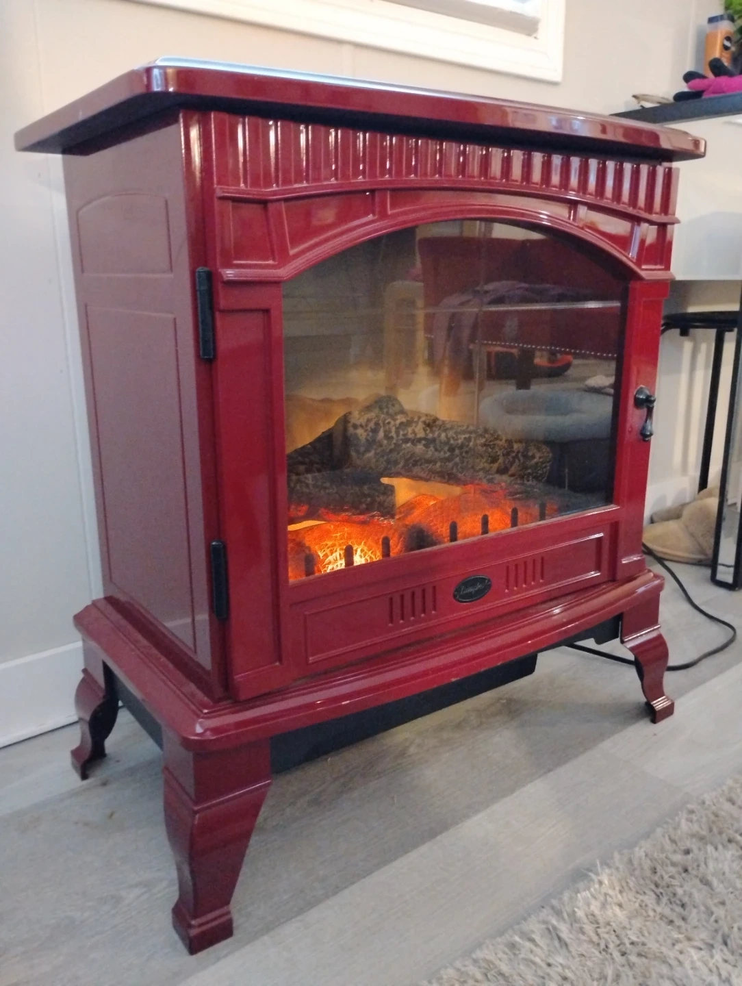 This is a beautifully finished deep red electric fireplace. It's fantastic as a space heater in any room. Featuring a high, low or visual only setting; the realistic flames and classic design will compliment your home decor nicely. Add in an ultimate warm, cozy touch and romantic vibe to your living space. It is quiet as a mouse, easy to use, no maintenance what so ever and in perfect condition. It is 24 inches wide, 26 inches long and 12 inches deep. It weighs about 30lbs. Please message me for pick up details.