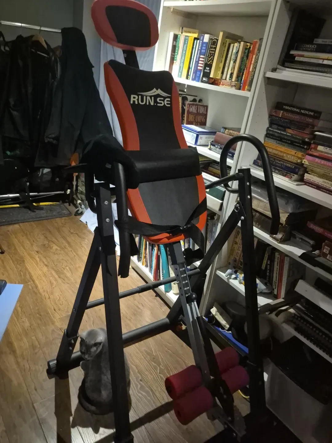 This inversion table is designed for back relief and flexibility. It features adjustable height settings for different users. Padded ankle supports and handrails ensure comfort and safety during use.
