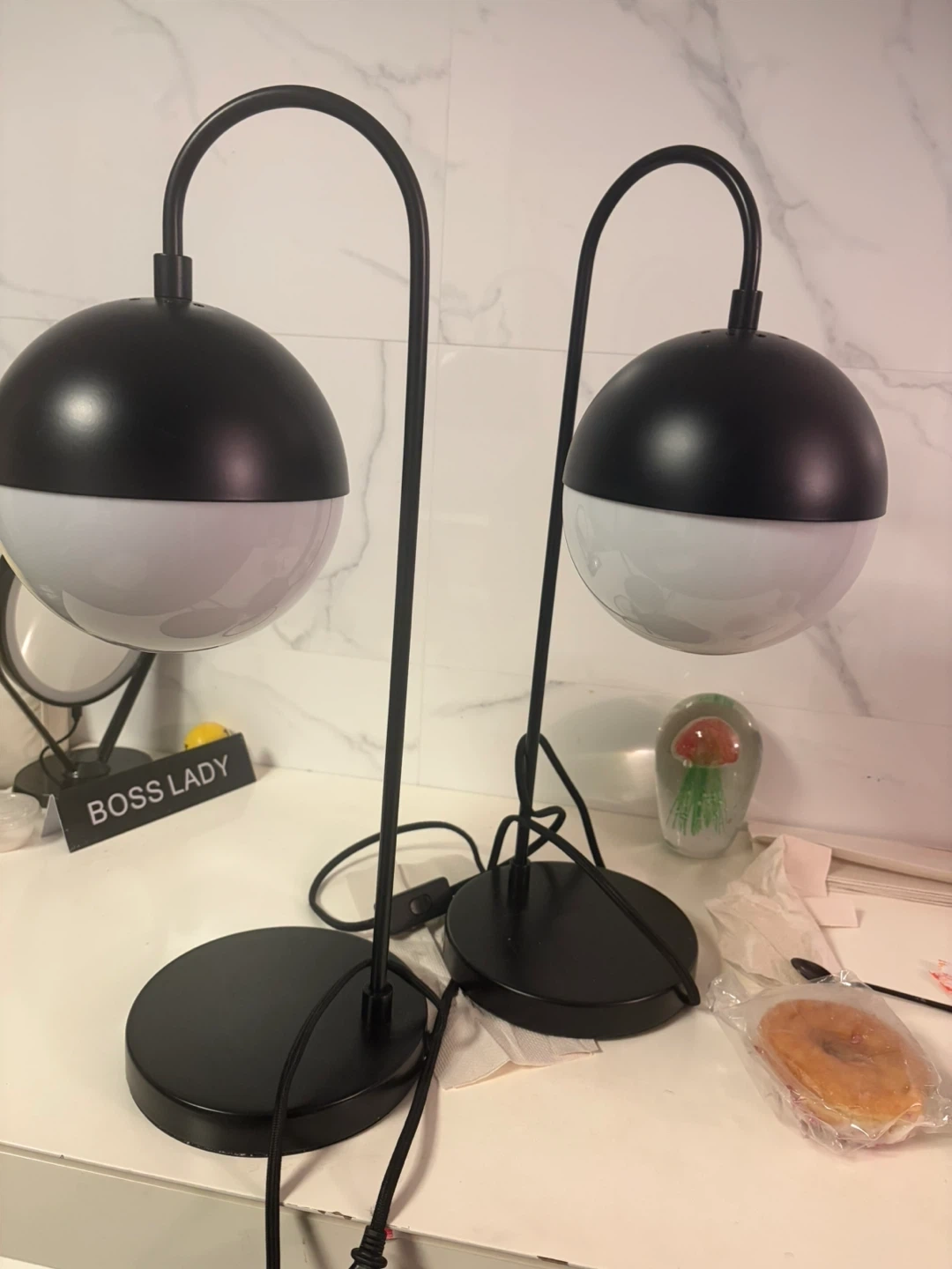 This Safavieh desk lamp features a sleek black metal design with an adjustable arc arm. The spherical shade is split between black and white, offering a modern aesthetic. It's perfect for illuminating a workspace or bedside table.