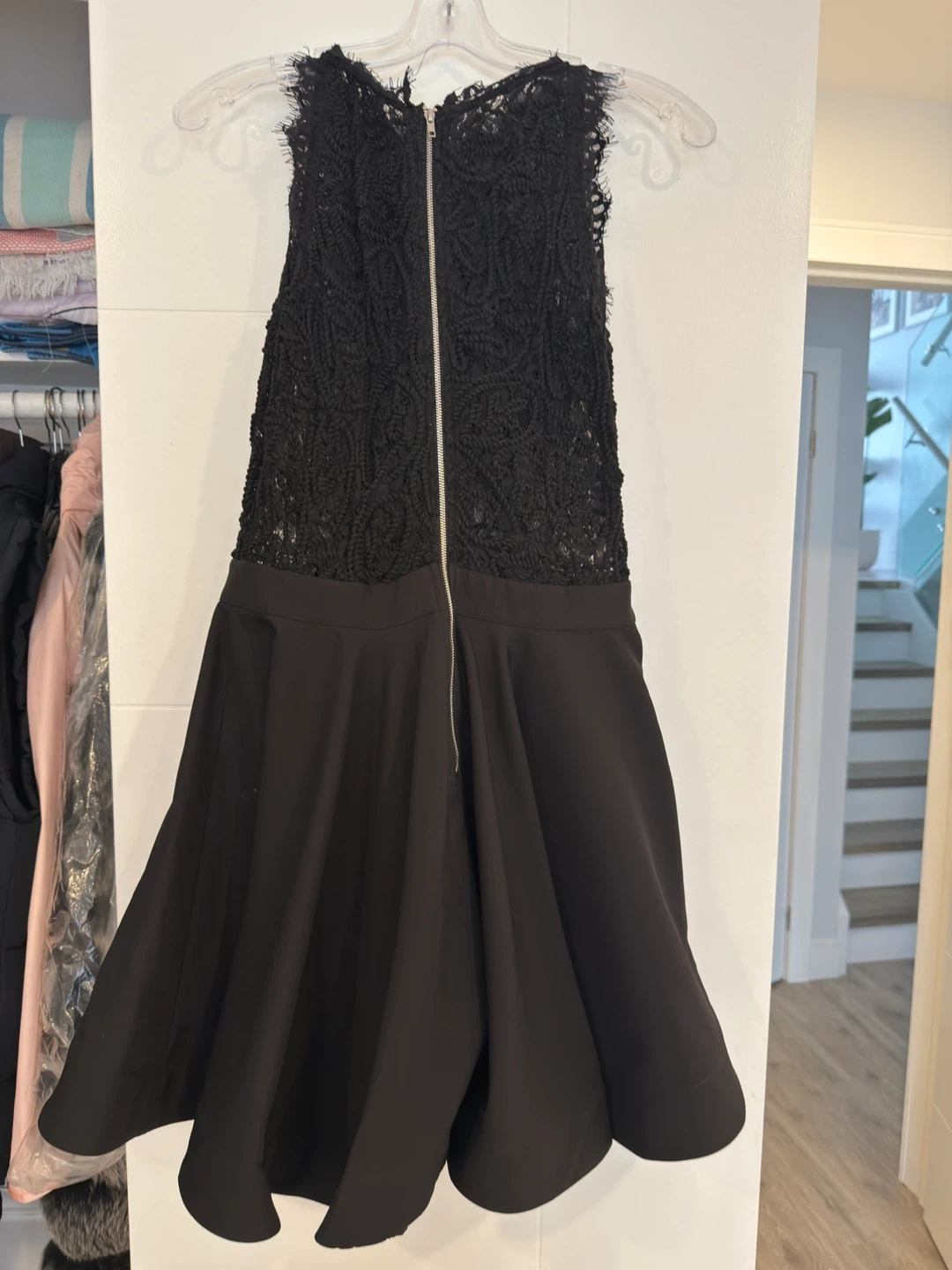 This black sleeveless dress features a delicate lace bodice and a full skirt. It has a back zipper closure. Dress is black.