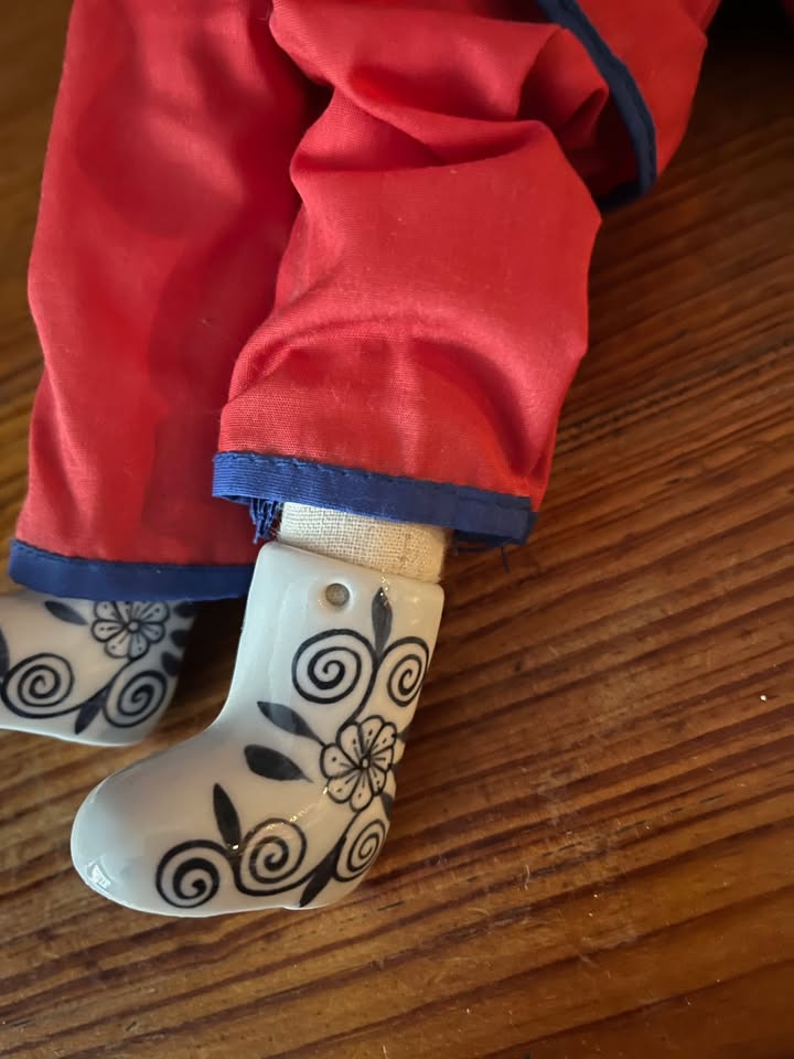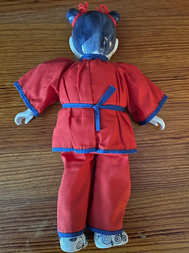 Handmade. Porcelain head, hands and feet. Soft body. 12.5 inches tall. Excellent condition (no chips/scratches). Purchased in Hong Kong in early 1980s.