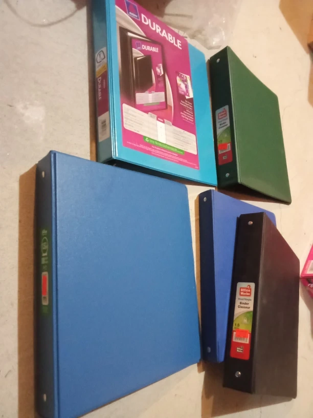 Selling a collection of binders in good condition. There's a Durable binder and some from Office Works. Great for keeping your documents organized!