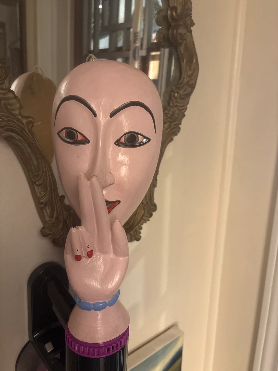 This unique decorative mask - known as a shush budda figurine features a stylized pink face with exaggerated features and a hand gesture. It's a conversation starter piece for your home decor. Carved wood - hand painted The item appears to be made of painted wood or a similar material. It's approximately 12 inches tall.