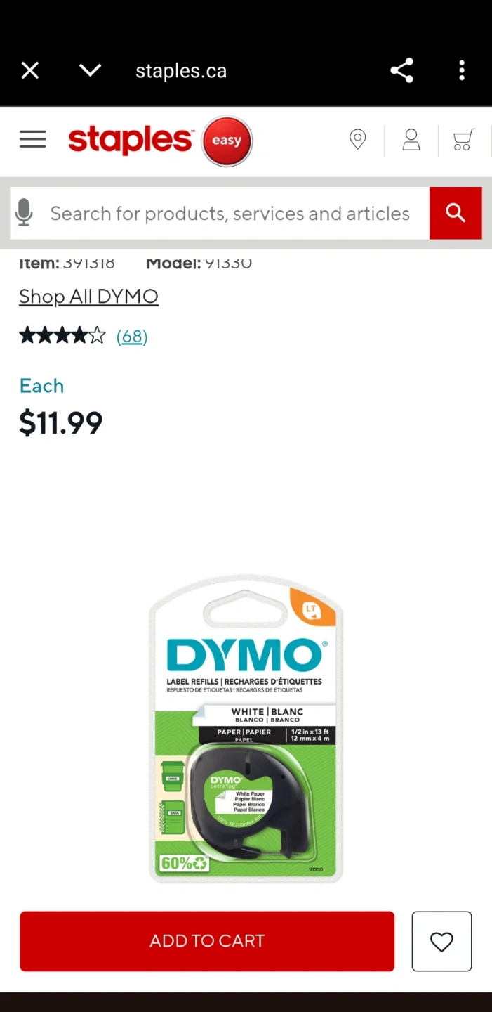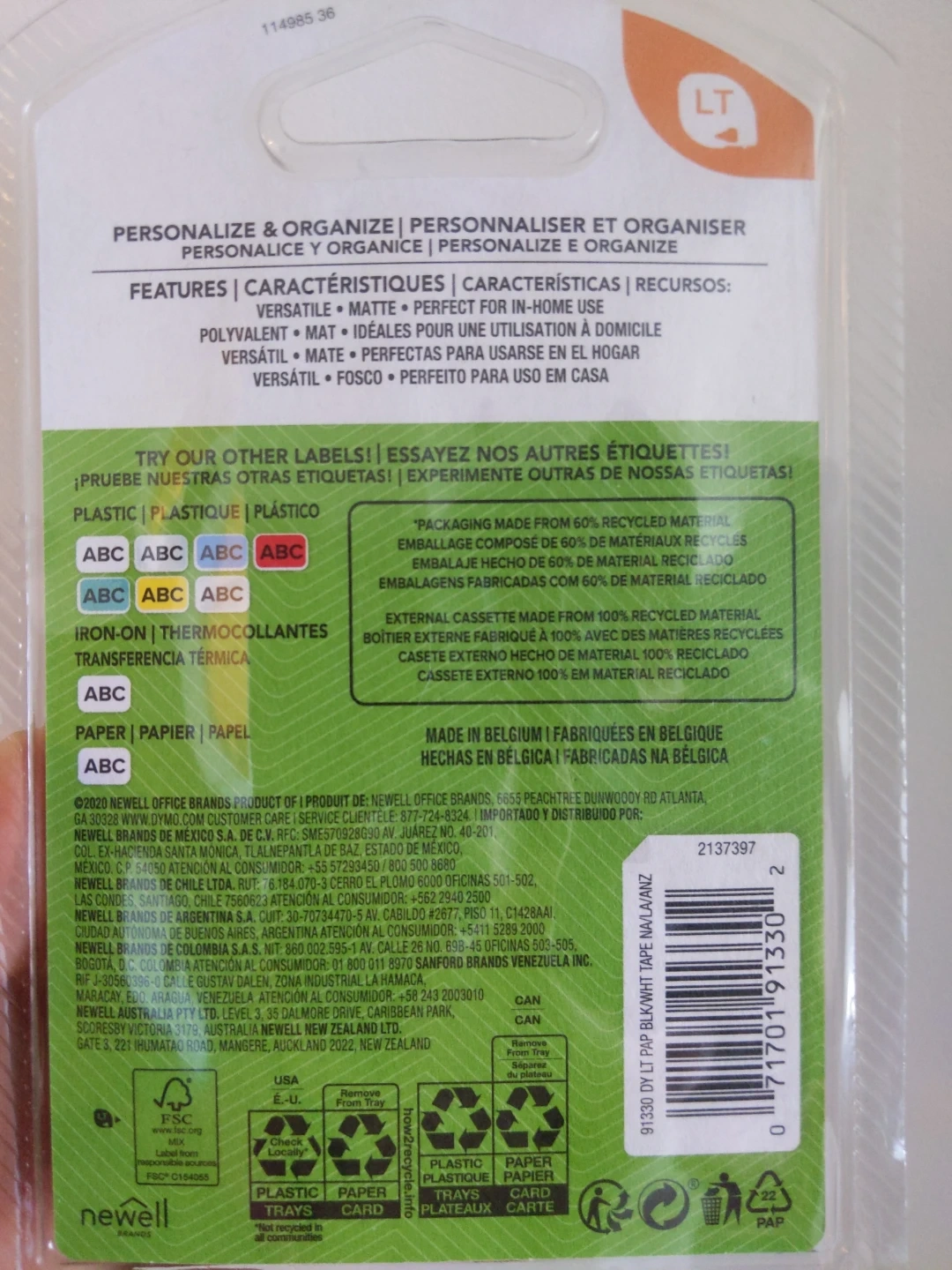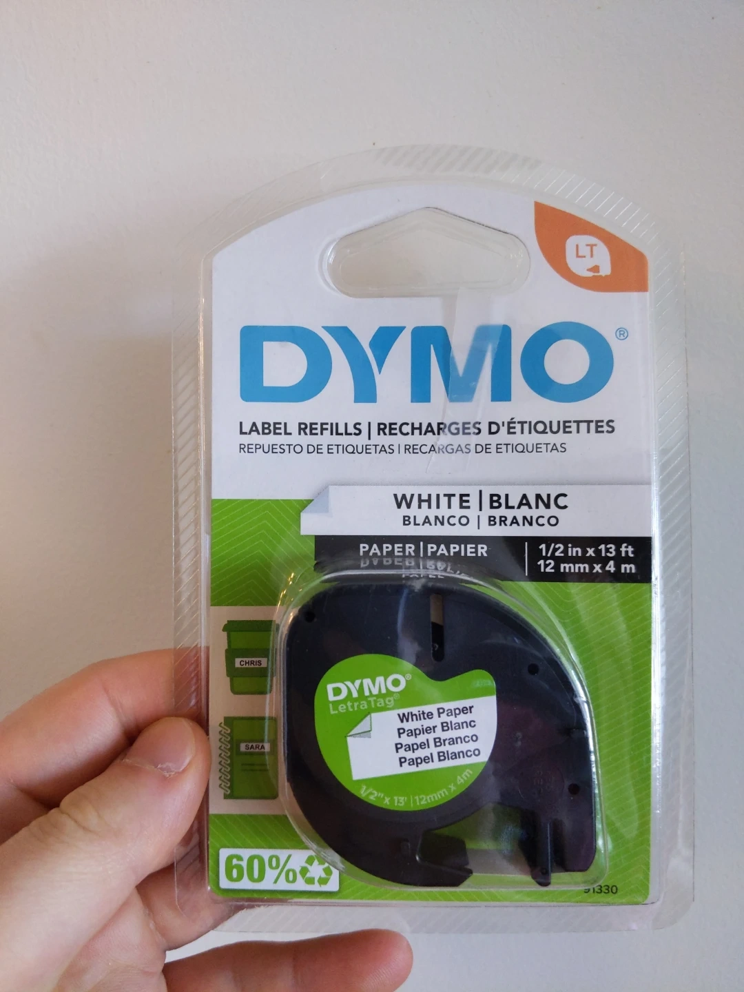 These are DYMO label refills for your label maker. The tape is white paper and measures 1/2 inch by 13 feet. It's made from 60% recycled material.
