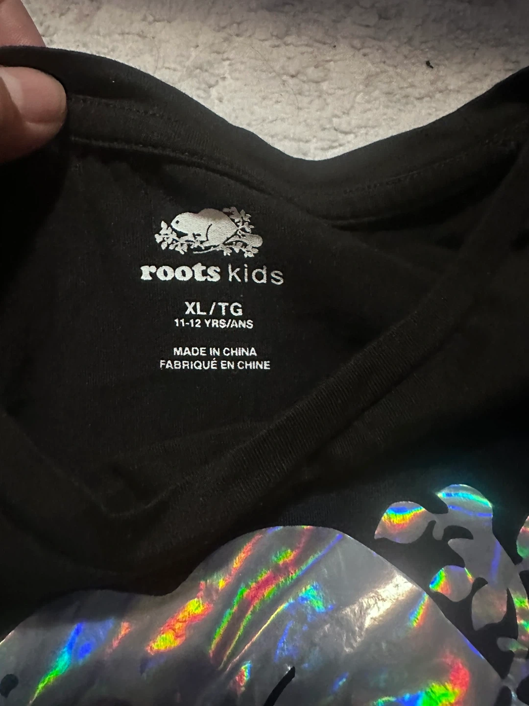Roots Kids black t-shirt in size XL, suitable for kids aged 11-12 years. It features a shiny, holographic Roots logo. Made in China.