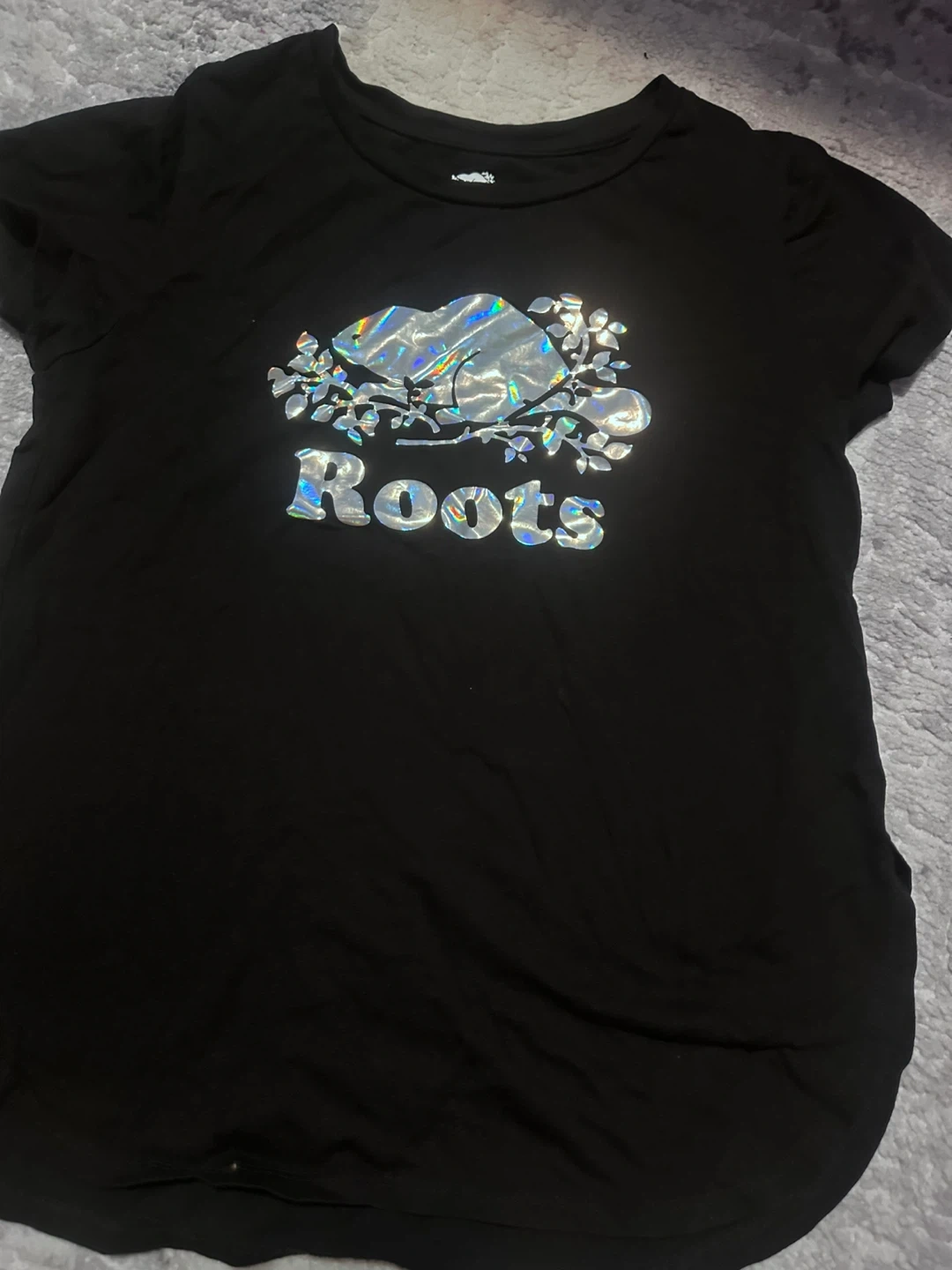 Roots Kids black t-shirt in size XL, suitable for kids aged 11-12 years. It features a shiny, holographic Roots logo. Made in China.