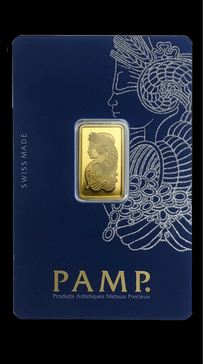 Swiss Made PAMP gold bar. This 5gram bar is minted in .9999 fine gold. Comes sealed in a protective assay card.