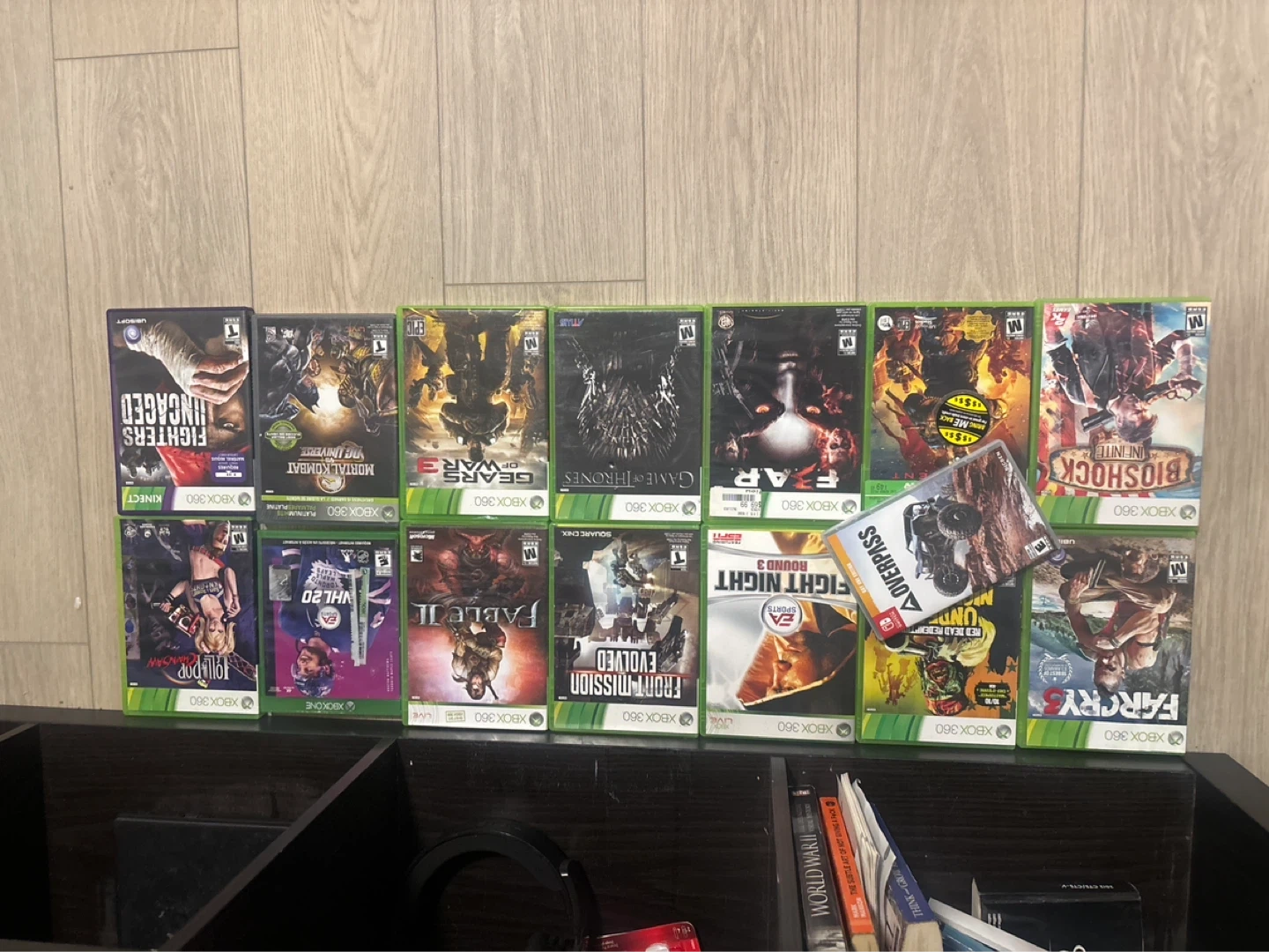 Collection of Xbox 360 games including Fighters Uncaged, Mortal Kombat, Gears of War 3, Fable II, Fight Night Round 3, BioShock Infinite, Far Cry 3, and more. All discs are for Xbox 360. 200 for the lot of them or 20 ea