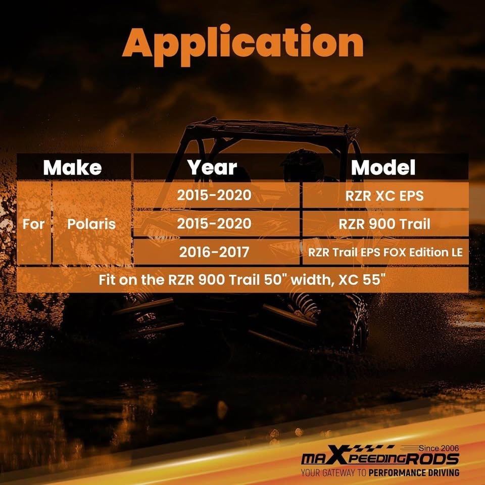 FITMENT - For Polaris RZR 900 Trail & for Polaris RZR XC EPS 2015-2019, for Polaris RZR Trail EPS FOX Edition LE 2016-2017 (Fit on the RZR 900 Trail 50' width, XC 55') 2 INCH LIFT HEIGHT - Provide 2" clearance of vehicle chasis, this will greatly help you to install larger tyres. DURABLE MATERIAL - Made of high-carbon steel for extra strength. And applying powder coating for preventing oxidation and rust. EASY TO INSTALL - Simply bolts on and need no modifications (No instructions included)
