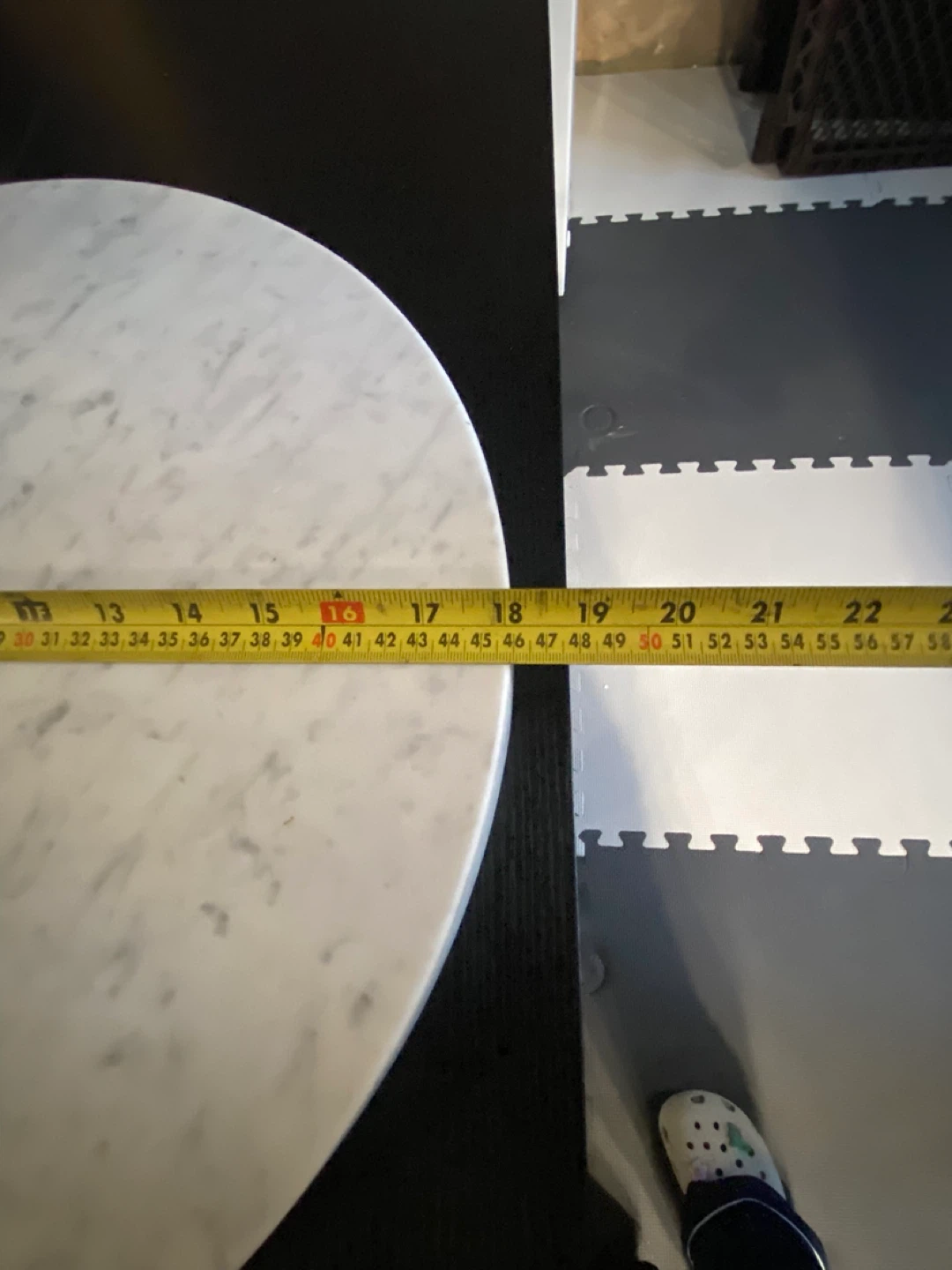 Round stone tabletop with a white and grey veined pattern. It's approximately 20 inches in diameter. This piece adds a touch of elegance to any space.