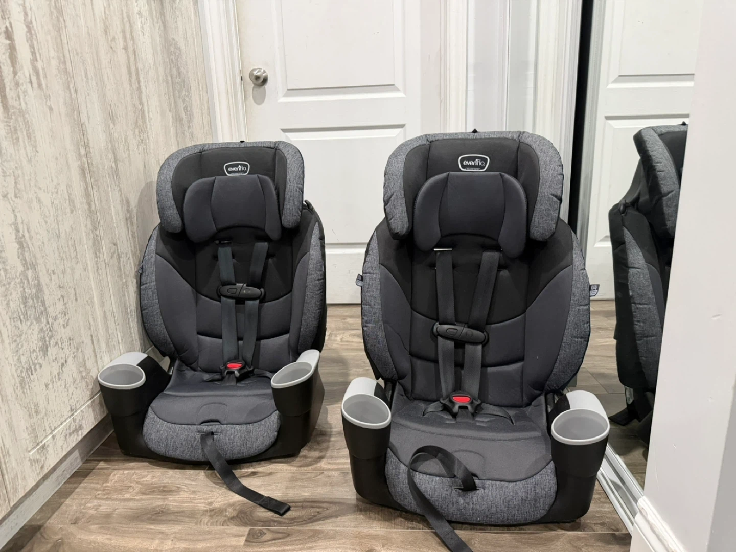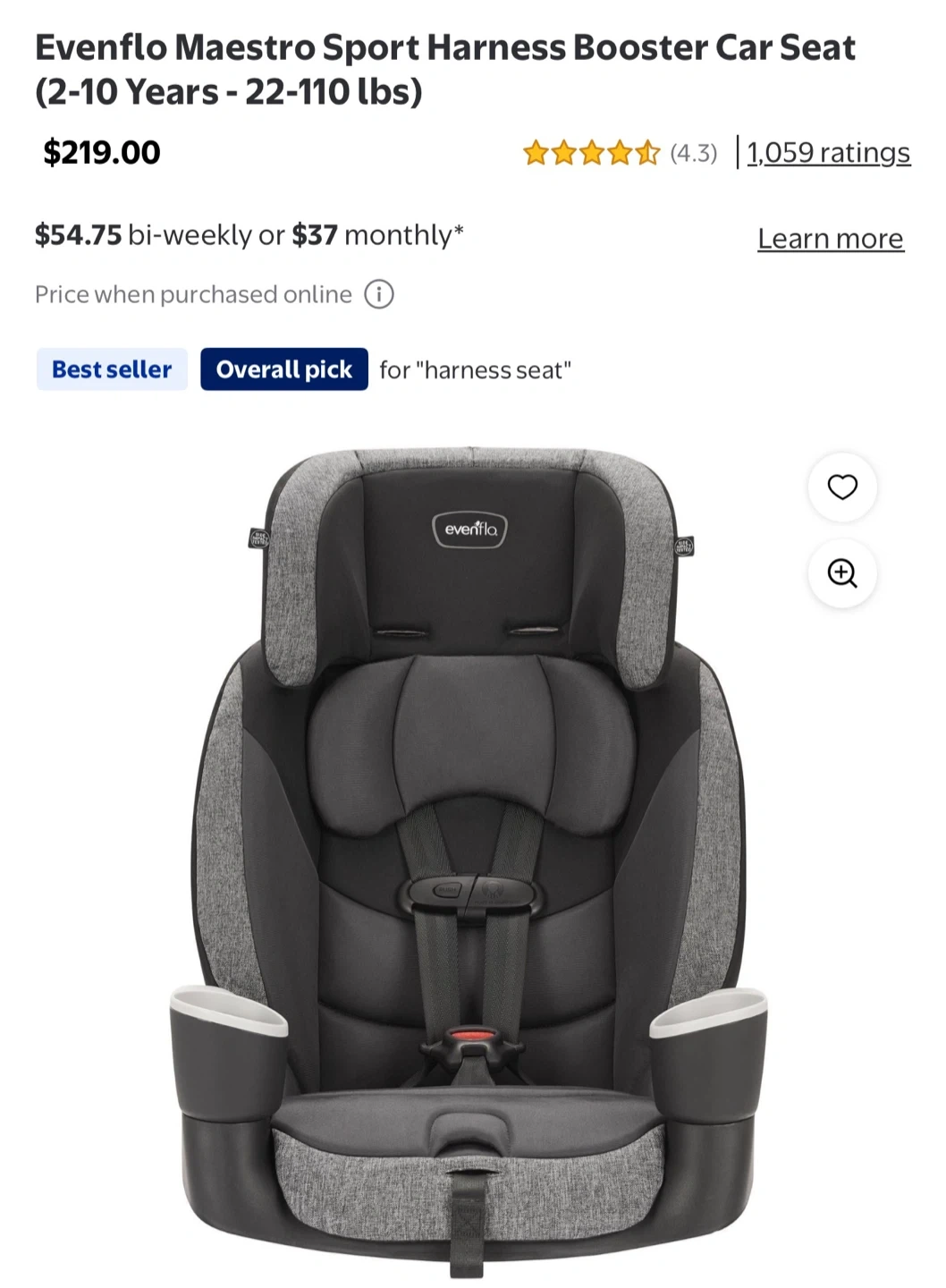 This Evenflo Maestro Sport is a harness booster car seat. It's designed for kids aged 2-10 years, weighing 22-110 lbs. It comes with two cup holders. $200 if they buy them together and $120 separately ☺️